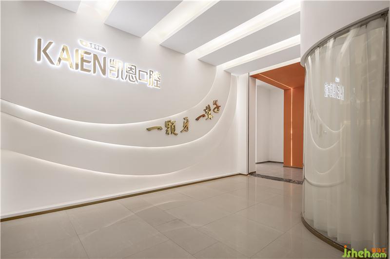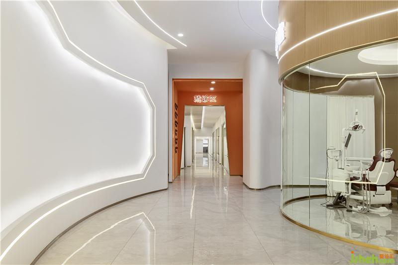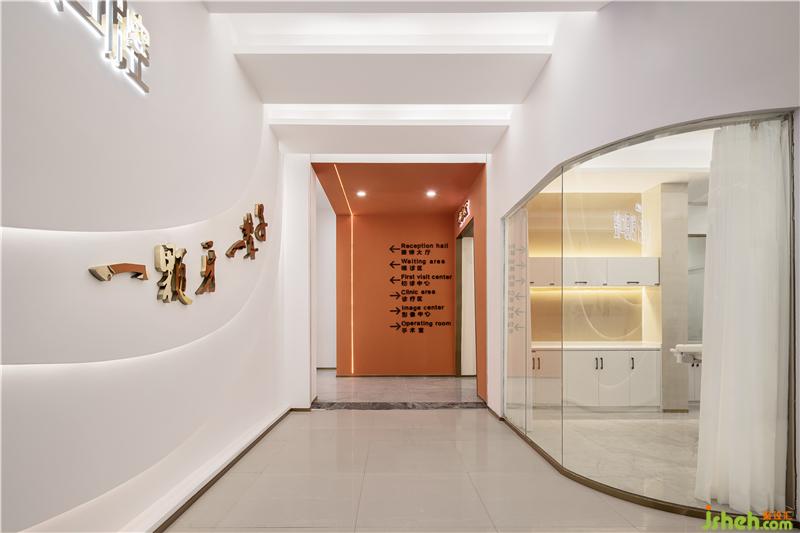 玻璃墙壁让走廊更具大空间感,不致于狭隘窘迫。独立半封闭式的诊疗室既符合医疗私密特殊性,又满足设计美观实用性,健康和美学不冲突。走廊一侧的背景墙用乳白色石膏板简单造型,一侧切割出几厘米的厚度,增加局部空间层次丰富饱满,预留出的企业slogan的位置,传达着友好温馨的信息。