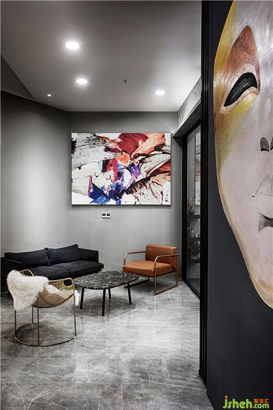 简洁线条造型隔断利落干脆,像极了重庆人率真的个性。两边留出主要的动线通道,保持通透、亮堂且呼吸感顺畅。入口处超大的摩登脸谱手绘图案,渐变矍铄金、澳洲甜蜜橘氤氲脸庞,哑光暗黑系质感漆打底加深主题印象。迸发出深邃与神秘的气息,让发廊艺术博览场景瞬间点亮,蜕变之旅从目及之处开启。