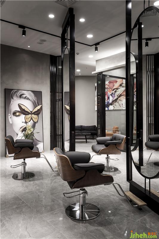 然而,《爱丽丝梦游仙境》的场景在此得到相似的体验,阵列灵活的几何落地镜像一张张神韵的魔法扑克。从兔子洞穿越到镜中,将每一个人的装扮期望值都被拉入这里。镜框造型由顶天立地公车顶纵梁演变而来,沿袭酷黑族磨砂金属框触感细腻,可由发型师360°按需旋转无压力,这与柚木皮质的沙发软硬适度的结合,配合客人一同演绎这出好戏。
