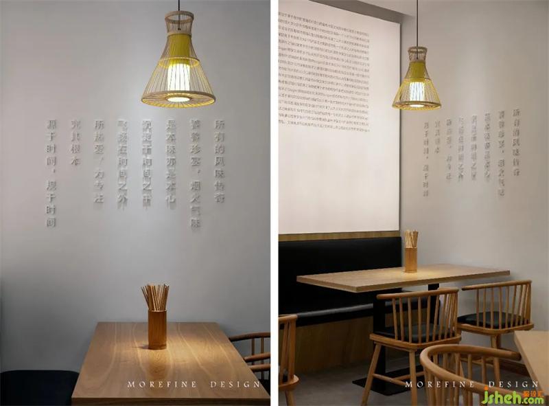 空间餐厅设计以瓷白色调为主,墙面背景饰画以中文方块字阵列组合为线条,形似“雁”型展翅,寓意春去东来祥兆如故,由北向南,而独爱这一味。