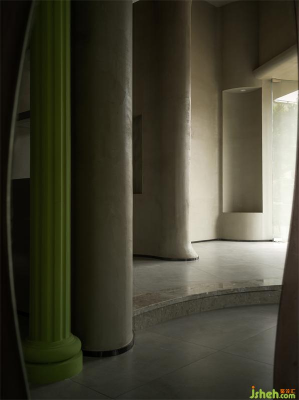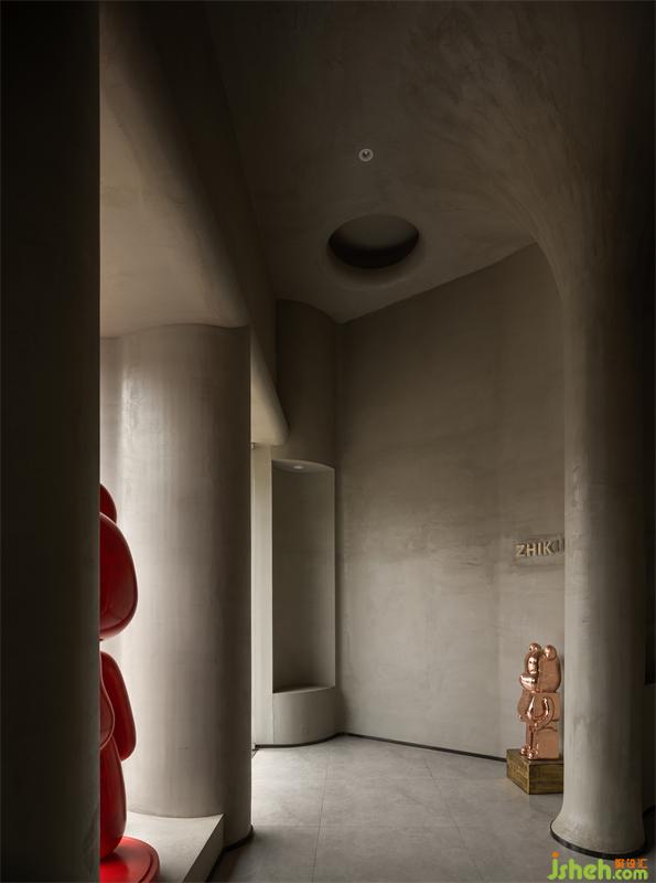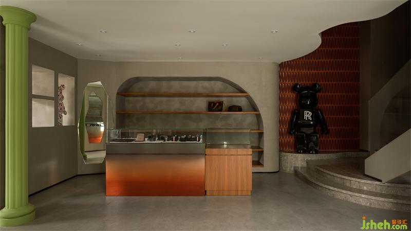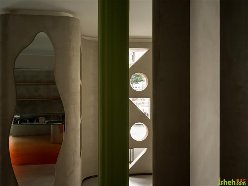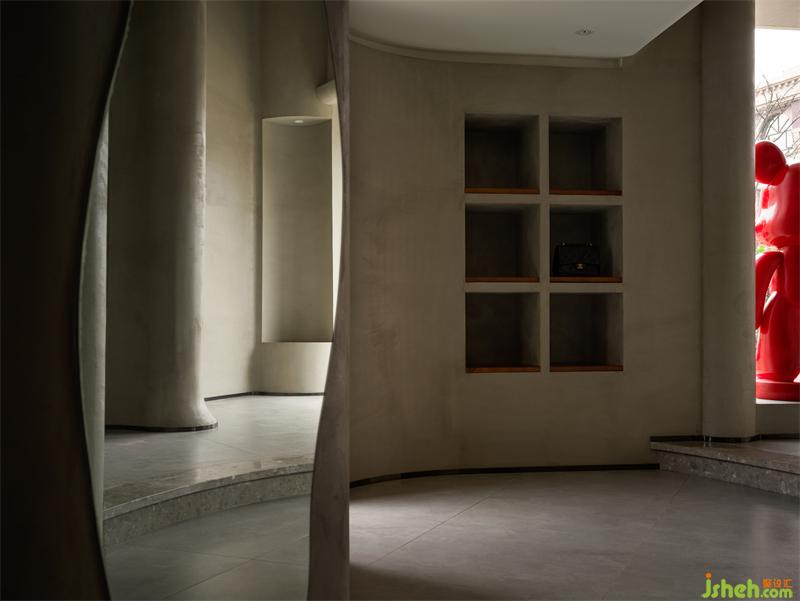 隔离了市侩的招摇,驿动的心被带入室内。店铺设计建筑梁结构与不同楼板之间的关系,与几何构造相互渗透,让复杂性聚合成一个整体。避免了机械的乖张,故意营造出让人诧异的破坏性影剧场景,特意手工打造的好几种斑驳艺术图案的漆面,在四季白昼的光线中渐隐渐显,与厚重的几何体块幻化交织,迭代出飘渺的神秘效应。