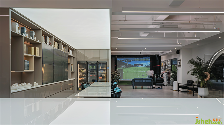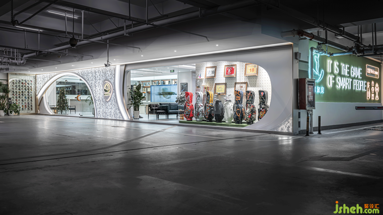 深圳旗舰店设计空间的元素用的极少,白色的直面墙体,有质感的水泥灰砖,细腻的曲面灯膜造型的转折,每一个变化都融汇在空间中,让观者感受到设计的用心,曲线的流线走向将室外景观和室内感受和谐为一体。弧形天花吊顶、不规则的水吧台增加了公共空间的柔和度和趣味性,而直线线条和LED灯条的嵌入为整个空间增添了动态和现代感。暗藏式的洗墙照明系统、装饰性景观元素和设计得像高尔夫球上的各式各样的圆点的纹理铝板门头,强烈地刻画了俱乐部的舒适氛围。大理石材质的运用,提升了俱乐部的质感,并用于标记一些非常特殊的区域,如悬浮的水吧台。有色玻璃和透明玻璃的交错使用,增强了公共与私密空间的对话,创造了一个有趣的视角。玻璃的冷峻、天地一色柔软的墙体肌理与因竖向帷幔的遮挡而隐约透出的“光墙”,构成细微的、巧妙的表情对比。