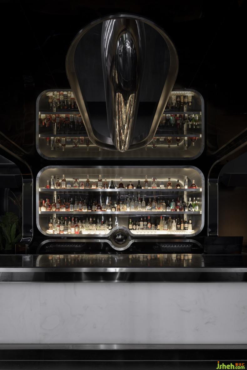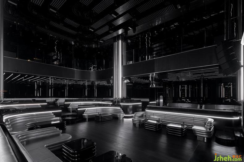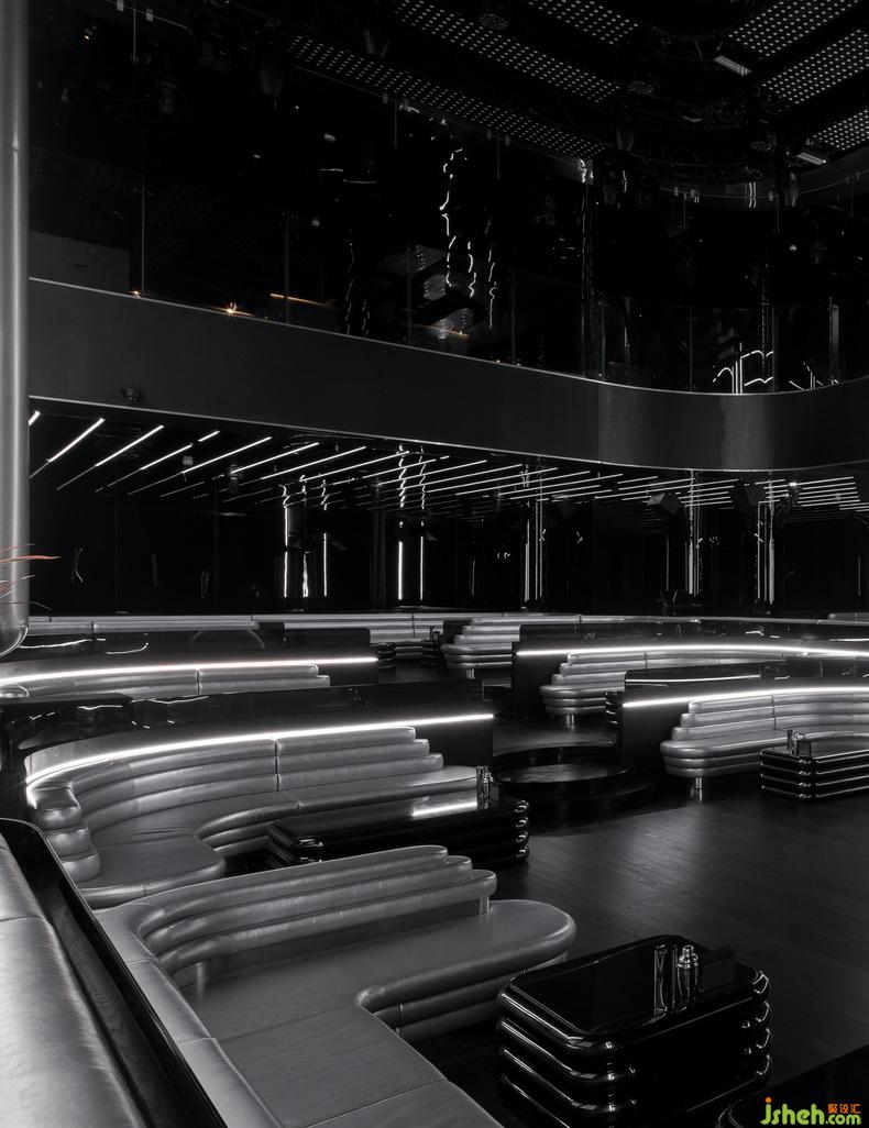 石材、镜面、烤漆、不锈钢、皮质等材料组合为鲜明的视觉传达,主色中却有有着近百种不同层次的“黑”。夜店设计形态简洁而抽象的有机曲线,亦打破横平竖直的构图并重新释义经典美学。