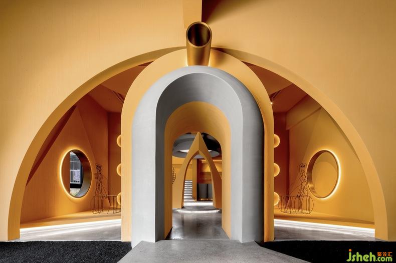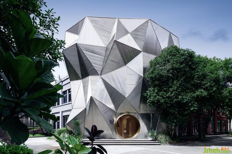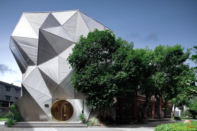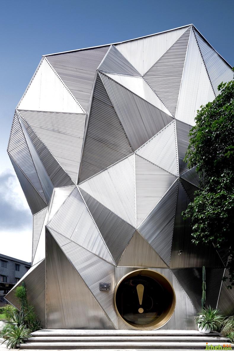 以瓦楞堆叠的悬崖作为外立面造型设计的概念,奇异的视觉体验涉及到复杂的工艺结构——不锈钢瓦楞板的收边与衔接,在建造过程中设计师不断思考和改进工艺节点与材料的处理,最终完成整体效果。悬崖洞口修饰巨大的惊叹号,牵引人们探索未知的世界。而一切先知的视觉画面都成为怪诞异形空间的索引。