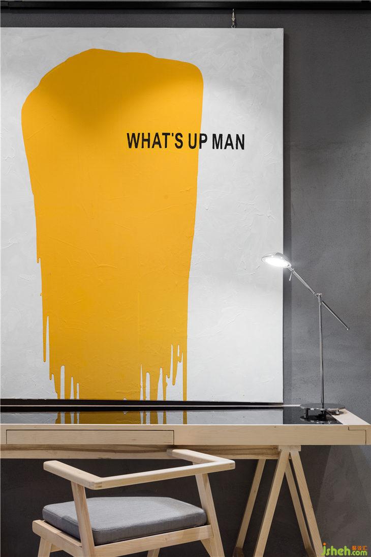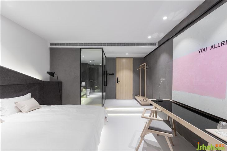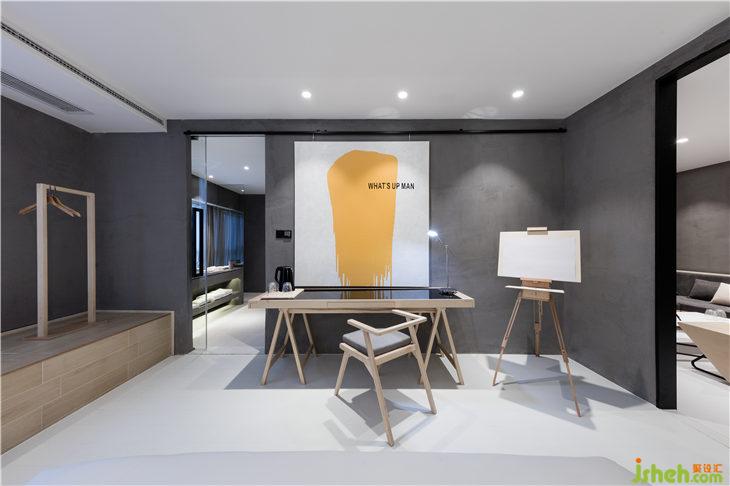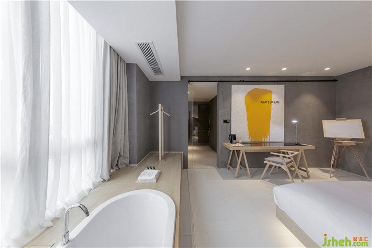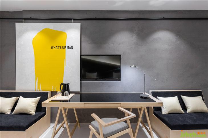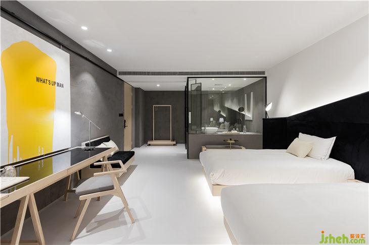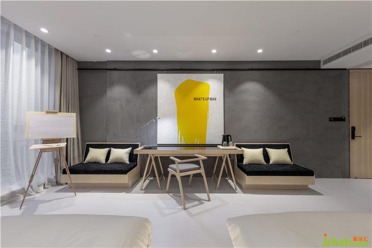 酒店坐落在杭州滨江区,星光大道商圈内。入口并不起眼,需要从商场内部进入,7楼。来到门前,小巧简白的酒店门口简单写着“麦尖”两字。设计师设计了一个小回厅在门口,人们需要看到酒店名字之后穿绕过回厅才能进入大堂,回厅的端景处,没有传统的条案配艺术品等装饰,而是一面酒店客房所有所需的用品立面展示,全部漆成白色,用玻璃封装而成一个橱窗,玻璃外面用橙黄色大大的写着“hallo”,像是客房里的所有物件齐聚一堂来欢迎即将入住的客人。