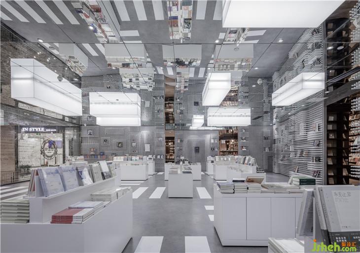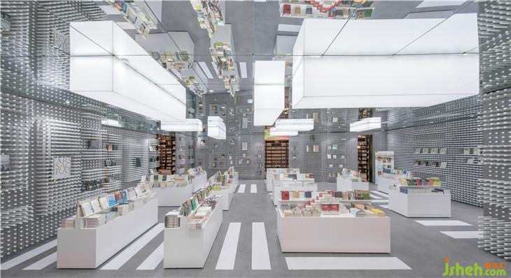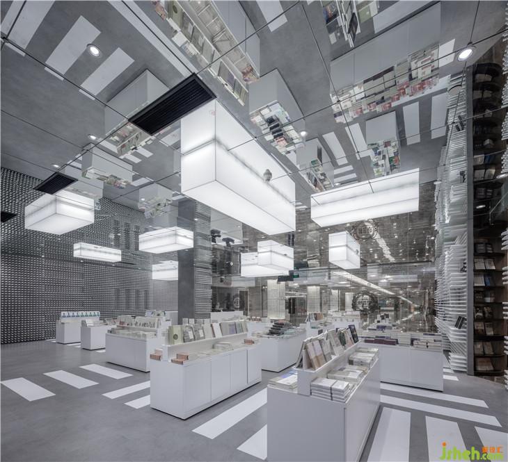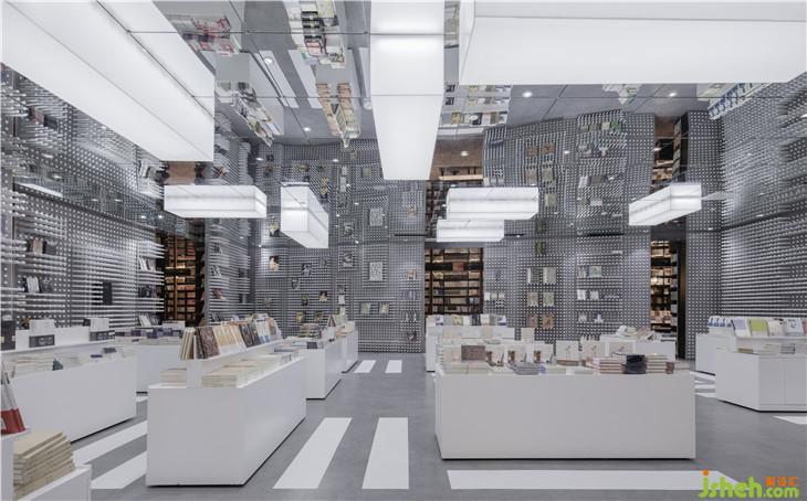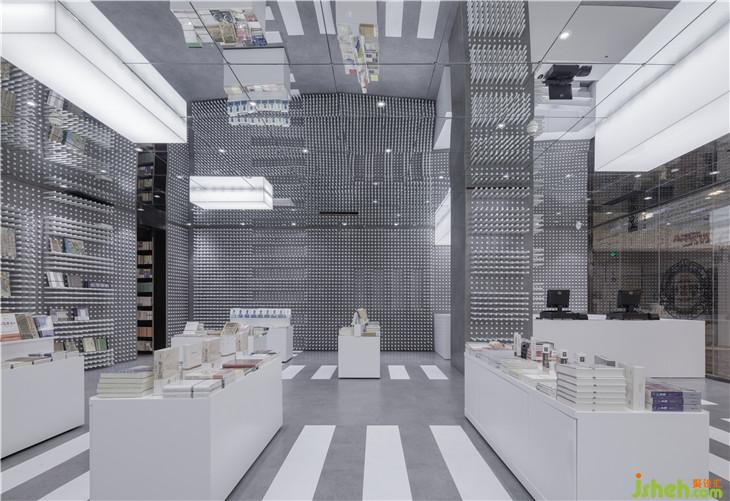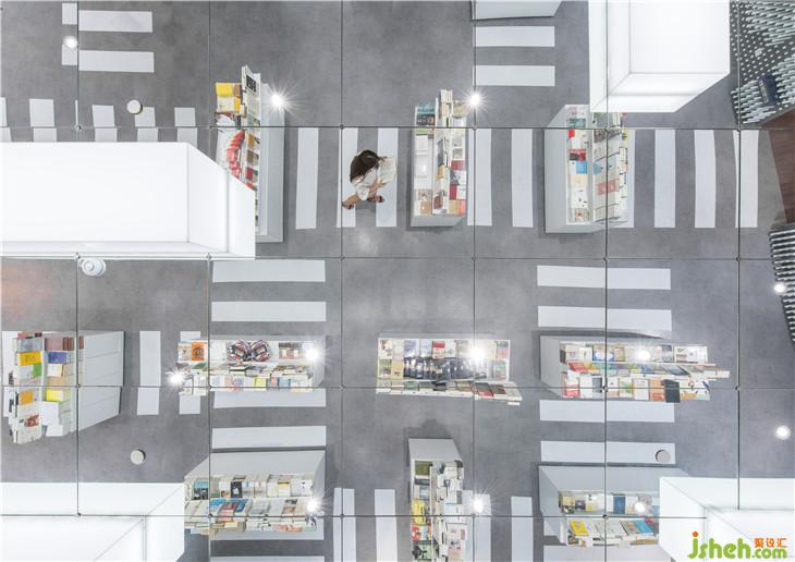 乘坐电梯来到四楼并向深处看去,可能就会看到钟书阁的字幕玻璃幕墙,隐约可见其中干净整洁灰白色调和谐晕染,安静的光晕透过字幕幕墙的空隙传递出来。走近,走进。你便知道这次钟书阁要讲的与书的故事与斑马线有关。这正是这家钟书阁要表达的情怀,也是上海这座繁忙的城市的缩影。素色的混凝土映射着着城市的马路颜色,白色摆书台横竖有致静立路面,链接每个书台的地面画着一条条白色的人行横道线条,明确指引着书台与书台间的路径。满墙阵列的白色的圆管每一根都可以自由伸缩进墙体,通过这样的机动性可以塑造不同样式的阵列图形,这种变换的形式亦是摆放书的架台亦同时更映射了快速变换的社会现状。在这里读者俨然进入到了一个城市空间,但是这里没有车水马龙,只有安安静静的路与斑马线,还有在书台上落成山的书。因为斑马线好比那一本本伴随我们成长的书籍。在对的时间,遇到对的指引。由此来表达书与读者的精神关联。室内设计师