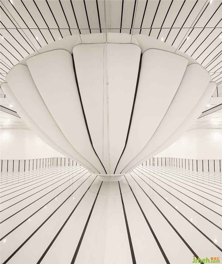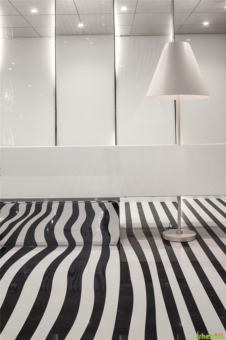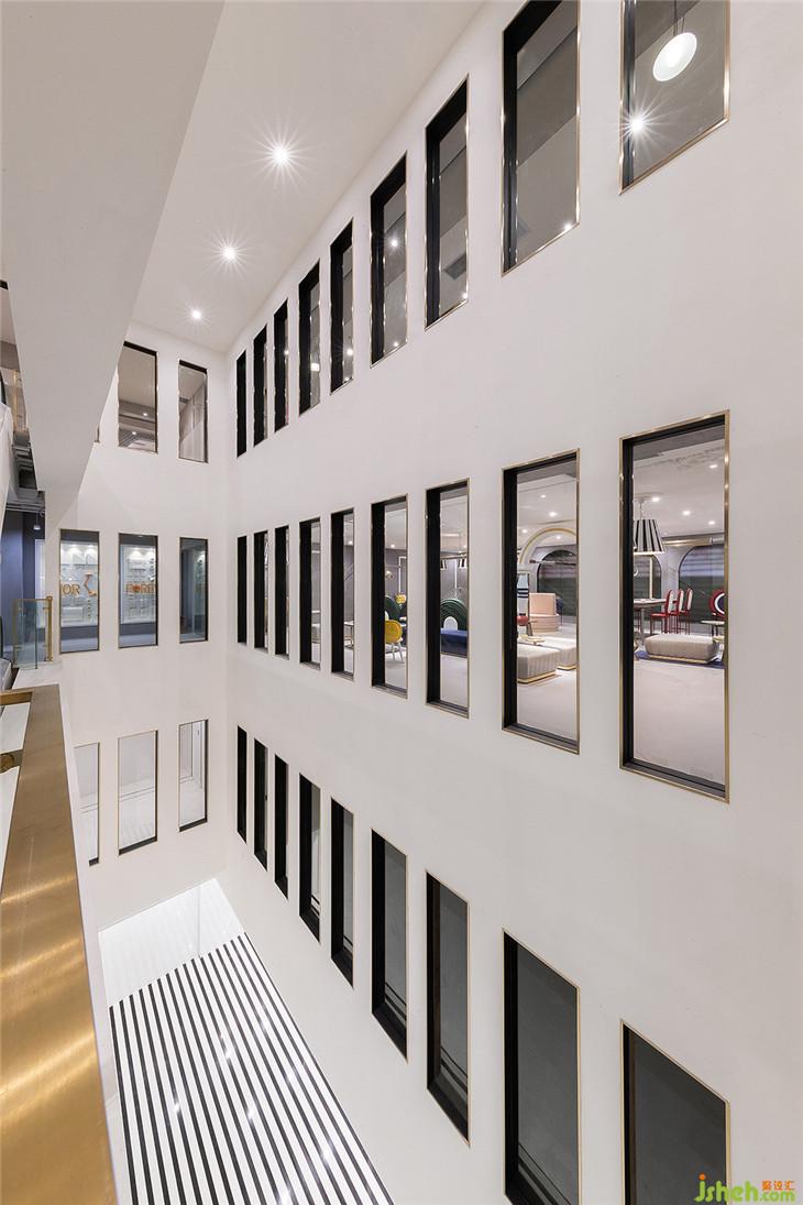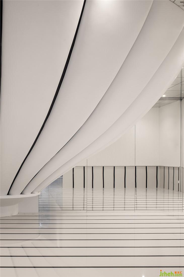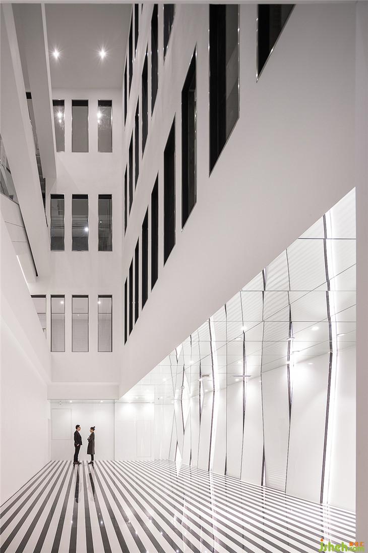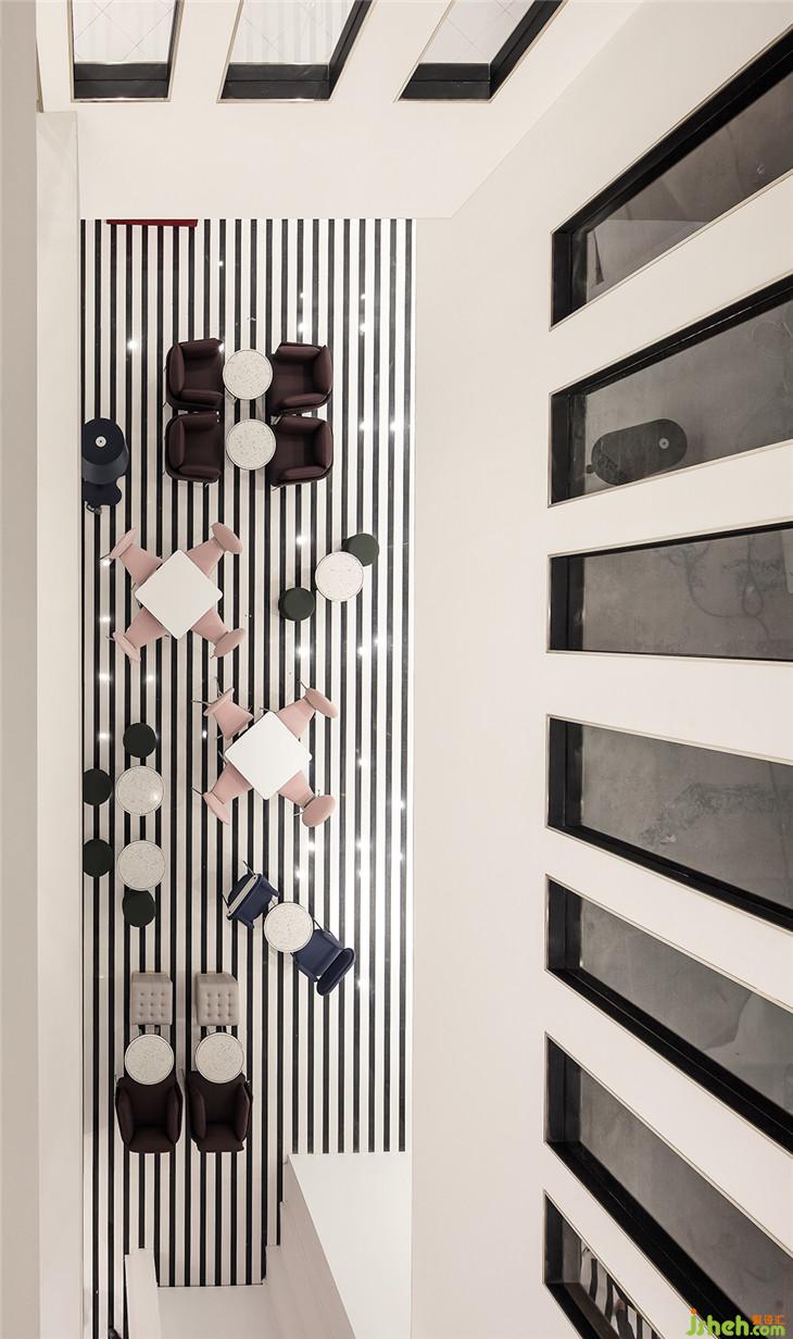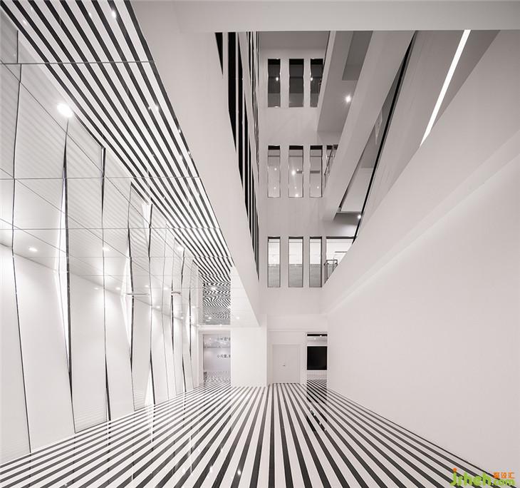 在一层我们设置了两个入口,南侧的主大堂空间,主要作为办公层的入口,主要承担接待问询的功能,我们留了很大的空白来体现大堂的气质。并且在内部我们营造了一个连通一到四层整个空间的内中庭,把建筑的外立面窗格做在室内,让人们在室内感受室外的建筑感,并且在扶梯的上升过程中能感受一到四层不同的空间美感。在大堂我们引用了水流的概念,黑白条地面水波纹的起伏,流动,象征着企业的承载和不断的前进。北侧的次入口,主要是餐饮层的入口,做了一个大型的热气球装置,作为视觉的焦点。整体白色的空间,为未来企业的宣传展示和小型展览留下无限的可能性。