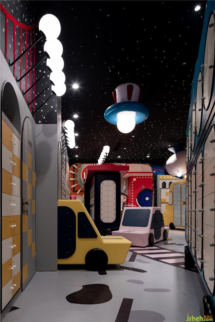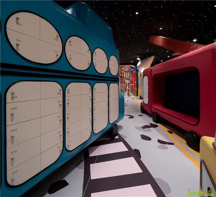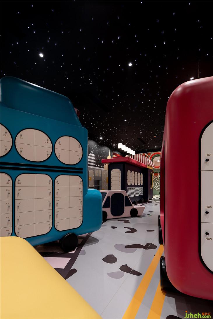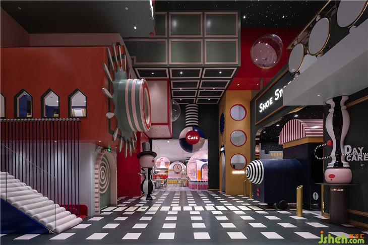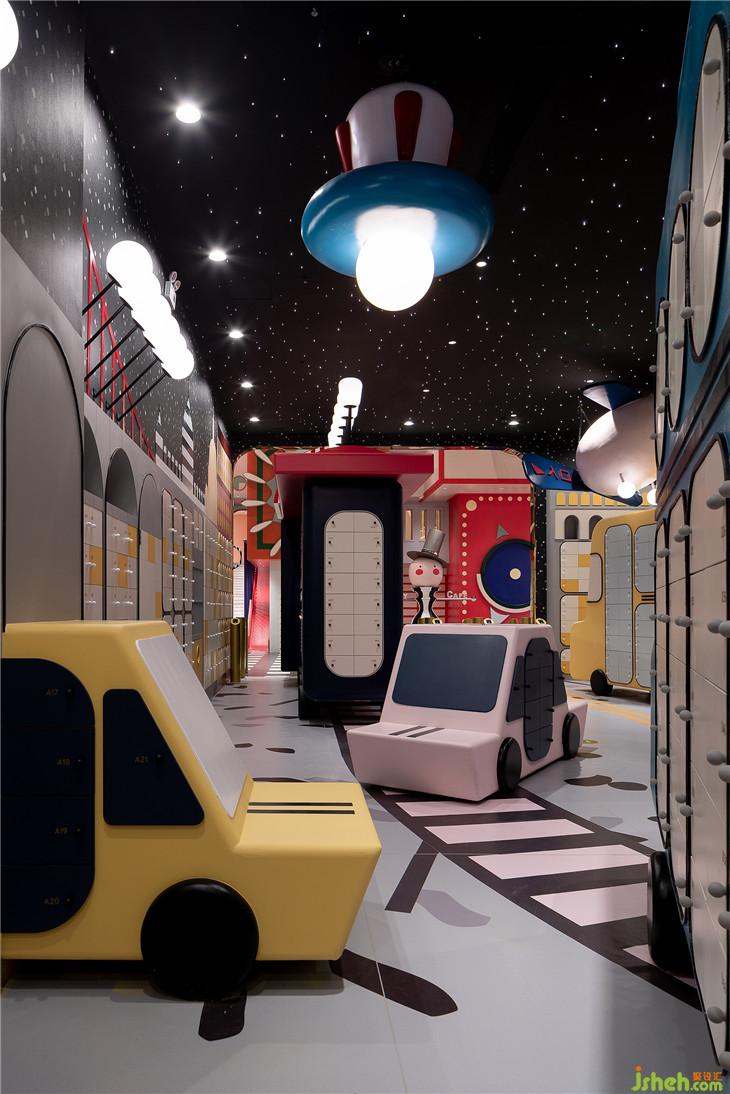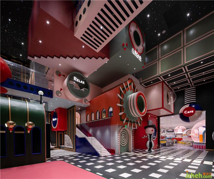 MELAND城市作为整个项目的交通枢纽区,是人群的分流处,亦是动线的交汇点。进入城市,模拟布达拉宫退阶型设计的房屋,增加了整个空间的流线感。整个城市采用了浓郁而富有戏剧性的舞台色彩,勾勒出格林童话般的神秘感和怪诞感。设计师引借游戏npc的概念,别出心裁地设计了一些卡通人偶装置,卡在人群动线的各个节点,它们既承载了指示标牌、垃圾桶等功能,又为空间的故事情节补充了生动的角色。遍布在各个角落的时钟元素,从天而降的巨大建筑块,时间的流淌和发展的痕迹以具象化的设计手法表现了出来,意在提醒家长们珍惜与孩子相处的时光。