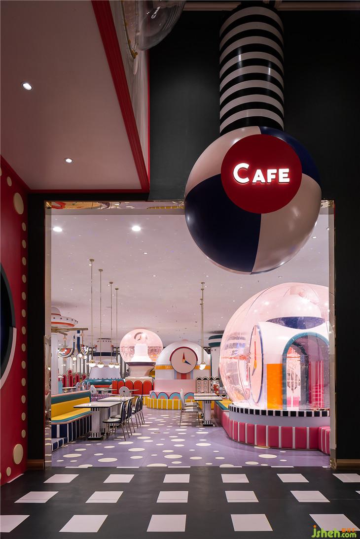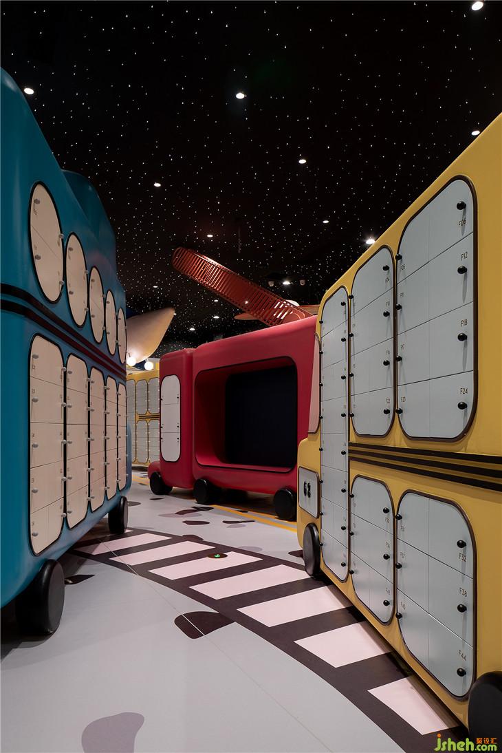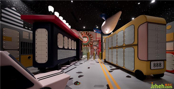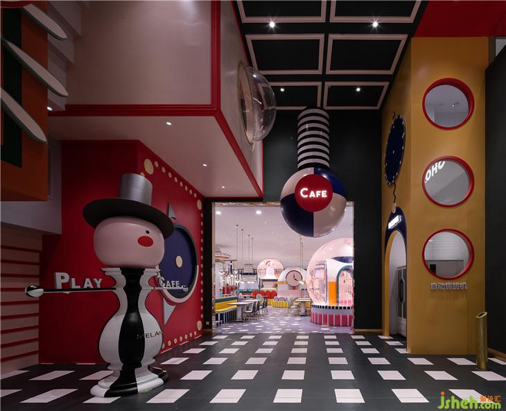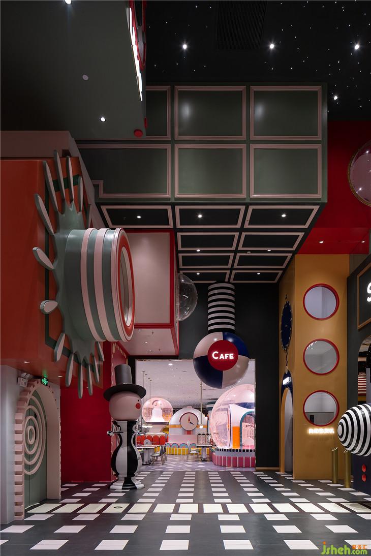 MELAND城市作为整个项目的交通枢纽区,是人群的分流处,亦是动线的交汇点。进入城市,模拟布达拉宫退阶型设计的房屋,增加了整个空间的流线感。整个城市采用了浓郁而富有戏剧性的舞台色彩,勾勒出格林童话般的神秘感和怪诞感。设计师引借游戏npc的概念,别出心裁地设计了一些卡通人偶装置,卡在人群动线的各个节点,它们既承载了指示标牌、垃圾桶等功能,又为空间的故事情节补充了生动的角色。遍布在各个角落的时钟元素,从天而降的巨大建筑块,时间的流淌和发展的痕迹以具象化的设计手法表现了出来,意在提醒家长们珍惜与孩子相处的时光。