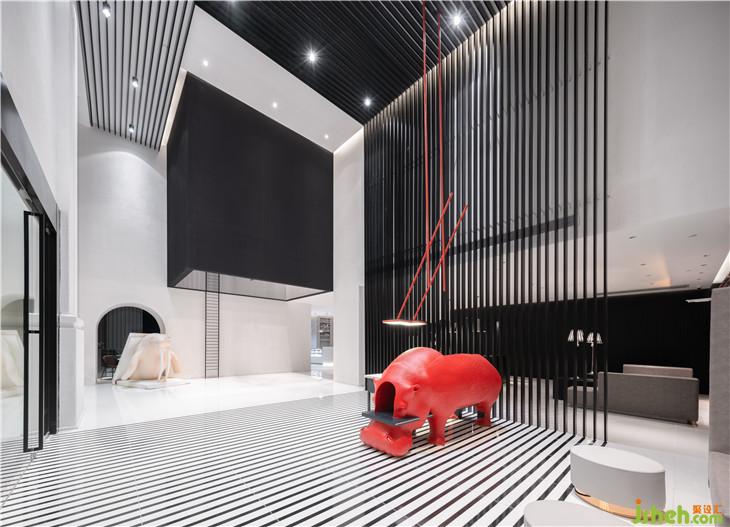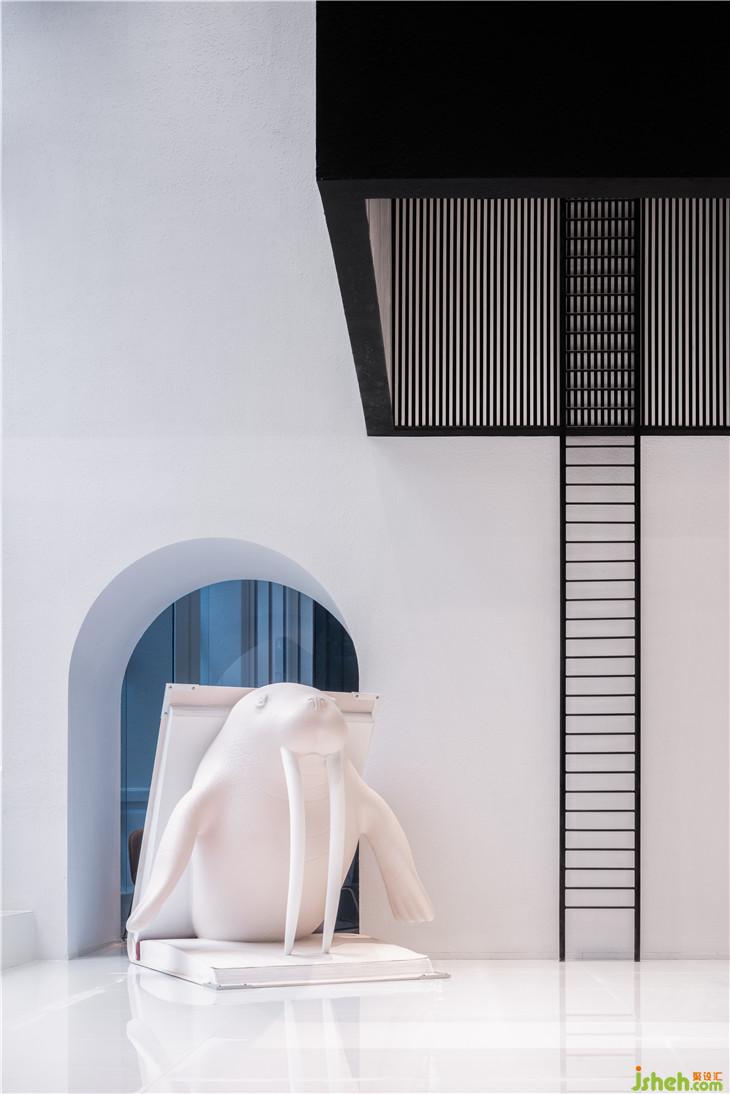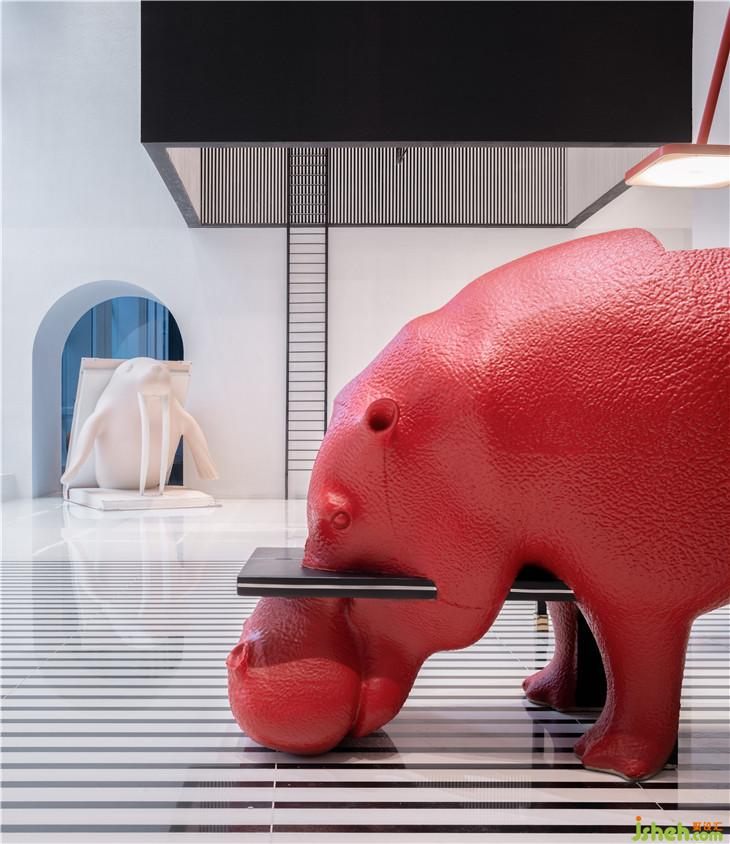在设计上我们放弃对风格的描述,对每组的艺术装置我们也放弃描述。而是先通过对结构、流线、色彩与图形的整合以来完成空间的优雅气质感,用抽象自然界的极简图案来完成衬托背景视觉,肃静极简的空间主体背景更引发消费者在这里有参观艺术馆的同理感触。后把对动物刻画的环节精雕细酌,并在细节上注重静物陈设的构图美学;主旨意在使具象与抽象糅合并体。并拿捏空间疏密比例,使得空间体现参与互动性,通过兴趣的引导从而引发视觉背后的思考。在整体设计的环节中,我们也结合动物主题研发多种原创艺术家具、画作及墙面墙面艺术装置环节,使观赏与功能性并存。所有的手法最终指向一种善意的示好,使一段美好的停驻时光变成更富有价值的记忆。