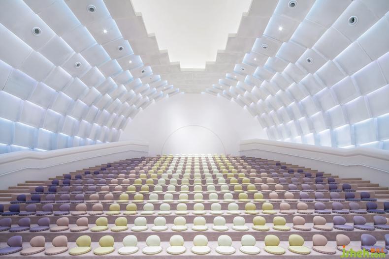 童话的质感与色彩在礼堂内愈加浓郁,球形的吊顶与白色的背景烘托了礼堂庄重圣洁的质感,点亮场内的背景灯,渐变色的座椅与灯光晕染出动人的霞光,让整个空间显得灵动柔美。孩子们仿佛在绽放的花蕊中,像一只只灵巧漂亮的小蝴蝶。