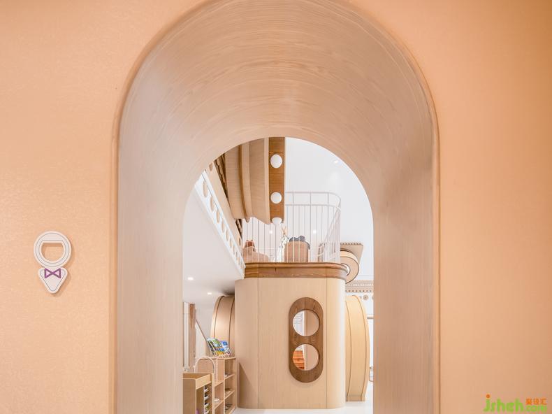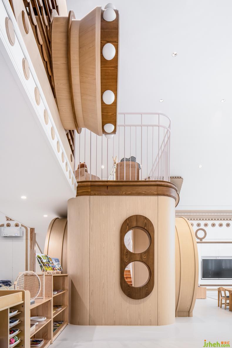 尖顶的建筑外形带来了特色的阁楼生活教室,幼儿园设计怀着“留下孩子们生命中的每一刻”的美好祝愿,引入了照相机这一设计元素。借用阁楼的挑高,设计师设计了可供上下攀爬的游乐区,满足小朋友玩闹的天性,而相机的镜头成了孩子们的通道与爬道。墙面童趣化的装饰呼应了家具的浅柔的木色,也勾勒出了精致的贵族感,让整体空间简约而温馨。