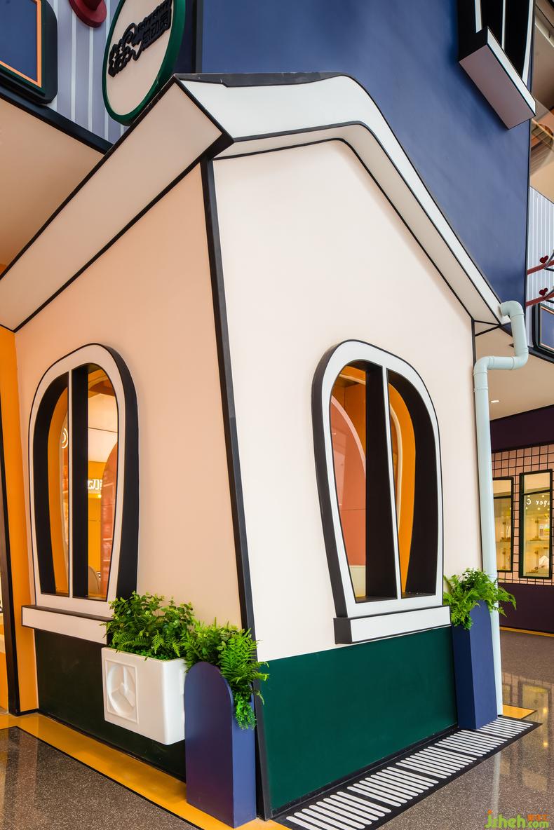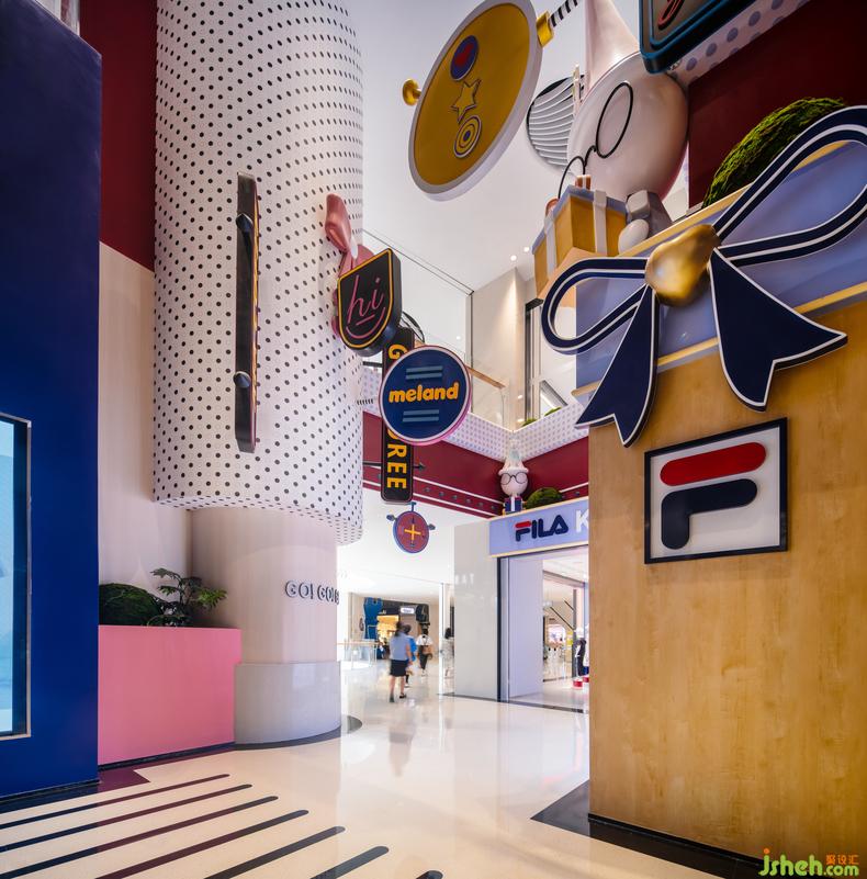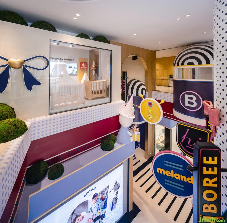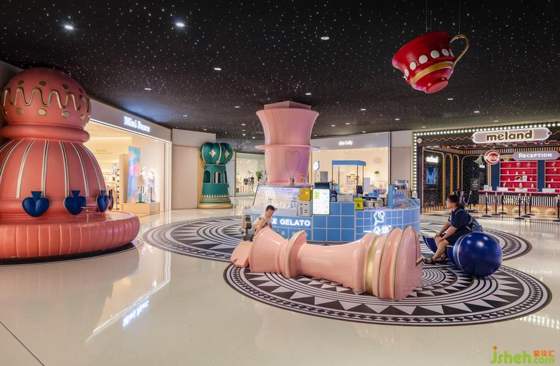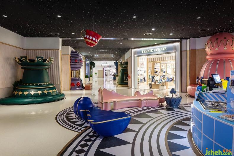 位于商场东侧的两个主题区以儿童心智启蒙为原点,分别打造了注重逻辑思维力和创想发散力的棋盘主题区和试管主题区。2楼的棋盘主题区内,设计师运用了爱丽丝童话的叙事元素与构图,用浓烈饱和的童话底色为空间渲染上了一层梦幻基调。绘本式的设计笔触让小朋友的创想世界突破进了现实空间,室内设计师还原孩子梦境的同时也鼓励着家长们偶尔也要透过孩童的眼光观察世界。3楼的试管主题区,设计师以寓教于乐的方式,引领并启发着小朋友对事物产生好奇心和探索欲。两个主题区都为孩童塑造了一场充分调动五感六觉的情绪性体验,是儿童成长过程中左右脑开发等启发式教育的实体教科书