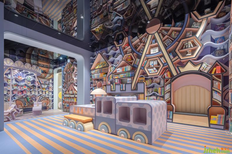 童书馆是承载小朋友愉快童年的缤纷之地。设计师采用简练形象的线条与图形,以童趣的笔触绘制出旋转的摩天轮,梦幻的小城堡等书架。又将游乐园人气项目旋转木马设计为摆台,邀请小朋友来与书籍交友,共度一段糖果般的甜蜜时光。书店设计热情明媚的橘黄,朦胧典雅的蓝紫冲撞调和,将梦幻快乐的色彩涂满整个空间。