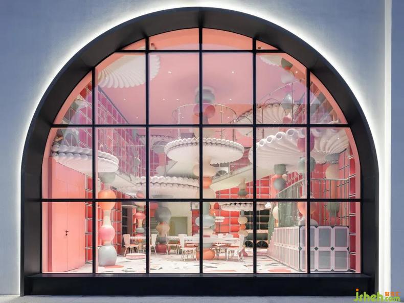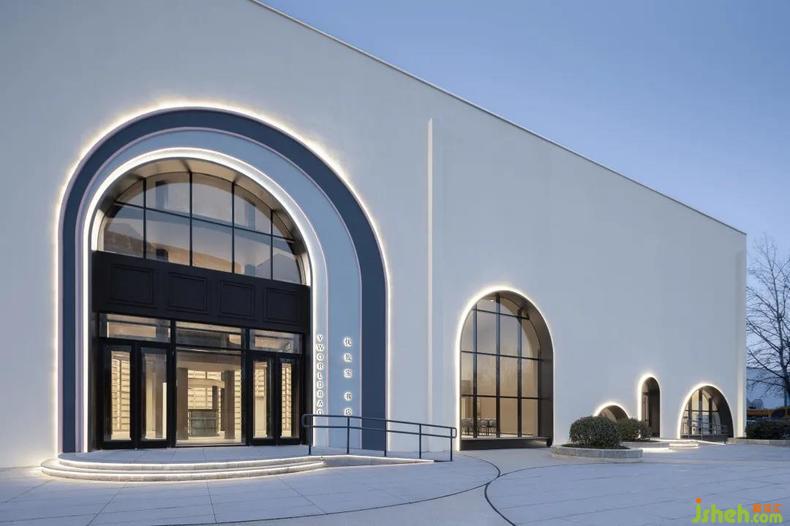 于方形的建筑盒体底部洞开一组大小各异的拱形门窗,曲线增添了些许柔和观感。门窗中不同区域的风光如画卷展开,吸引客群的目光,延伸空间内部的印象与意蕴。入口恢宏的尺度赋予了人震撼的身心体验,纯白极简的建筑外壳中包裹的极致梦幻内核眼入眼帘。