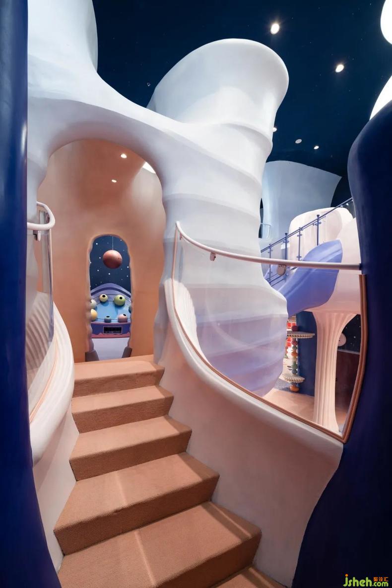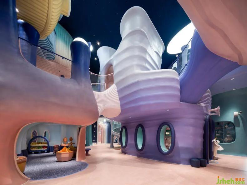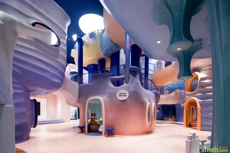 乐园设计抽象出珊瑚的形态,再重构为一座座烂漫的珊瑚房子,彼此连结,簇集为千姿百态的珊瑚礁乐园。天花板上的夜空星光安静洒落,珊瑚悄然呈现着夕阳余晖下渐变的多彩。高约十米的模拟城下,设计师打造出一场属于深海的神秘盛会,孩子们沿着流畅的动线穿梭于立体层次丰富的模拟城,如一只只漂浮在珊瑚礁中的小鱼,探索眼前应接不暇的新奇风光,体悟海洋作为生命摇篮的伟大。