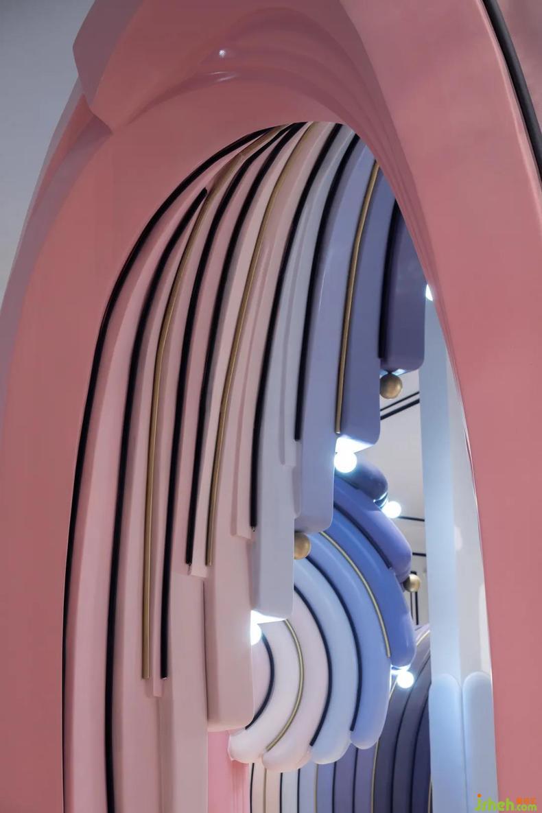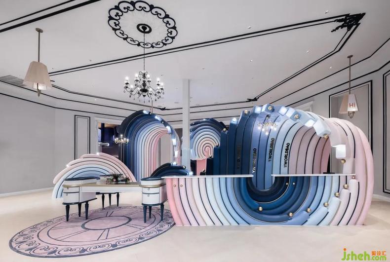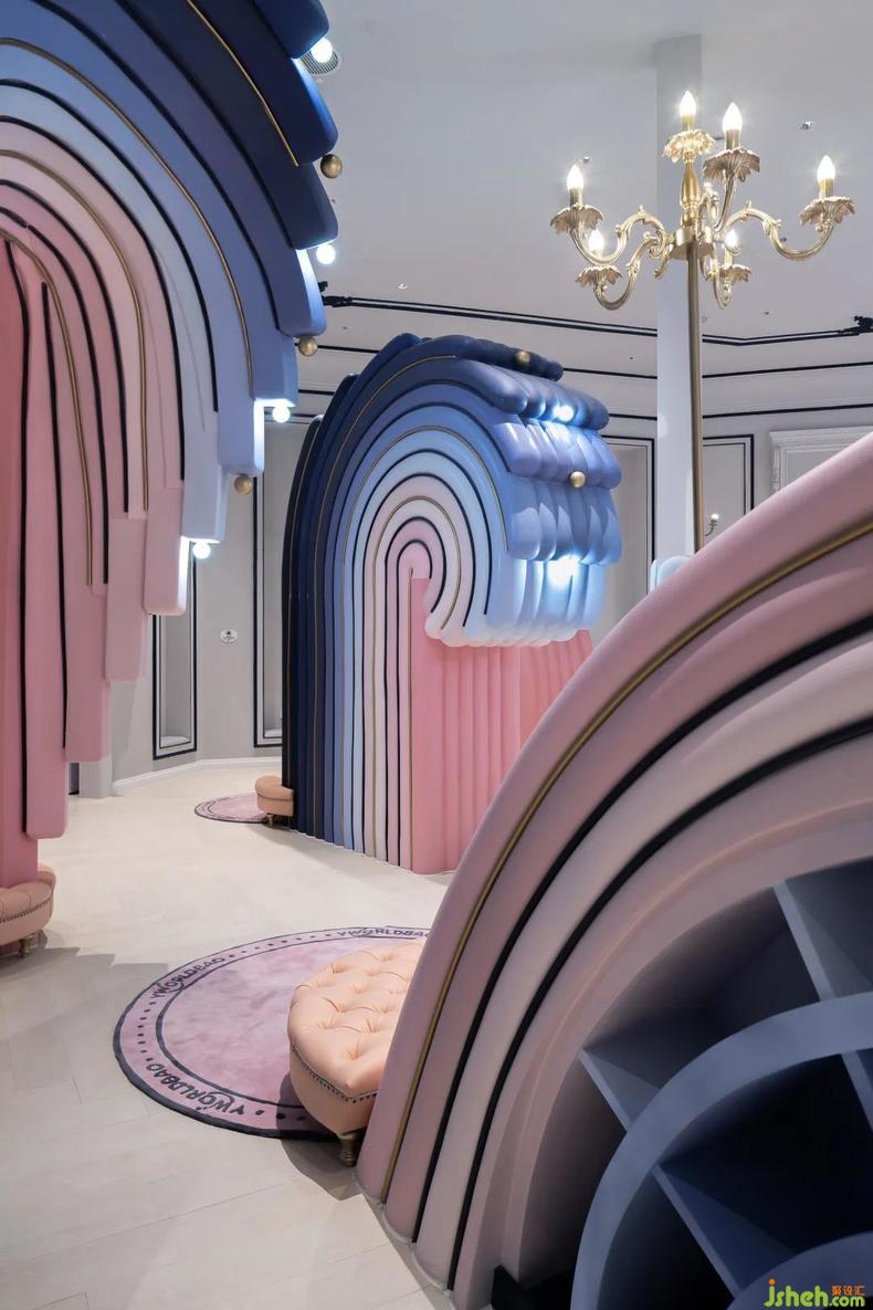当客人步入接待换鞋区,聆听眼前海洋的潮汐奏鸣。设计师将功能和美学统筹为整体,艺术性地提炼浪花元素演化为鞋柜与服务台。乐园设计形如彩虹的甜美浪花在室内翻腾,堆叠出瑰丽的海面,以多功能L形前台为中心的单向动线串联了接待区和零售区,并激活服务台对双区的服务属性。