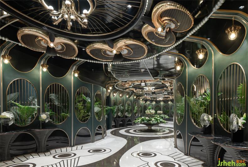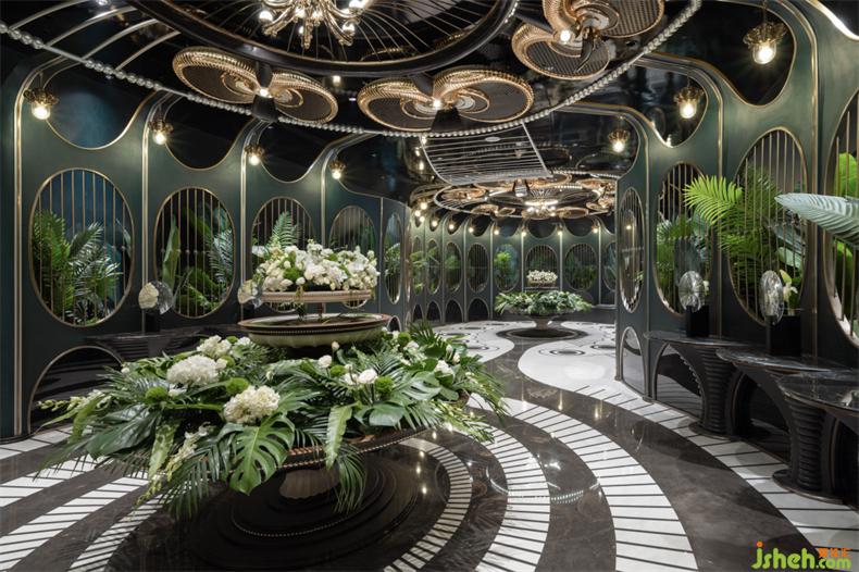 绿色壁纸形成空间的第一层表皮,设计师再以曲面延展的格栅为其覆上了第二层表皮,空腔内置入绿植,室内造景的野奢妙趣便生机盎然。