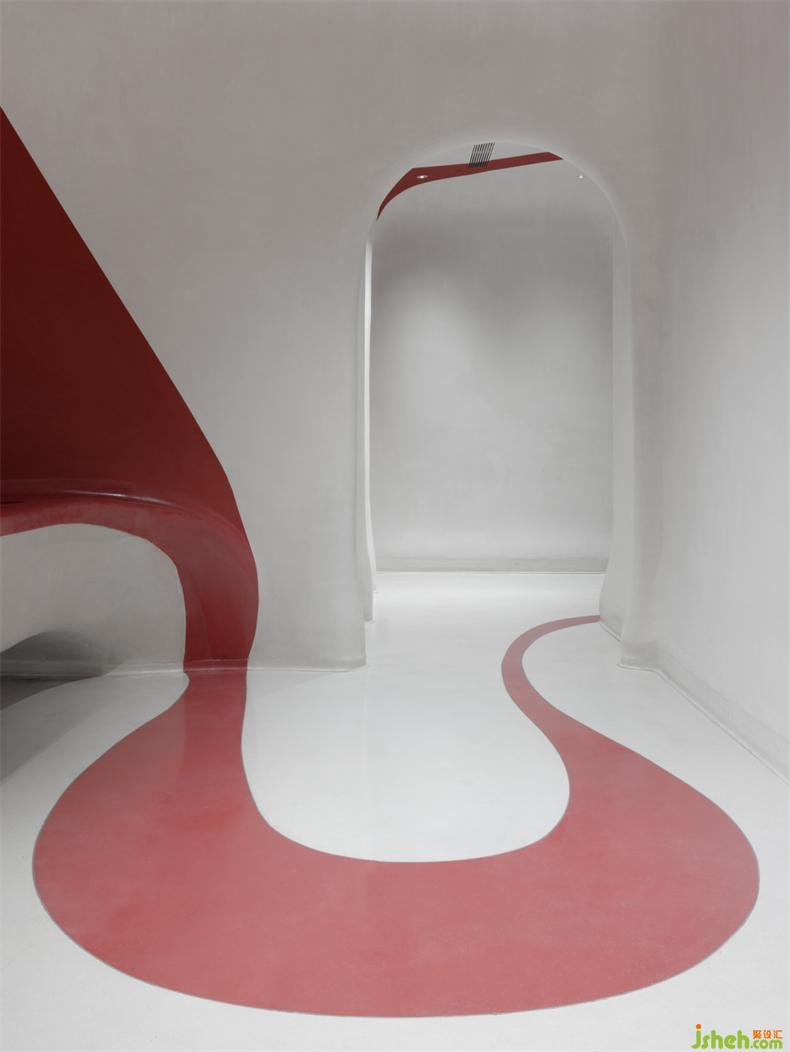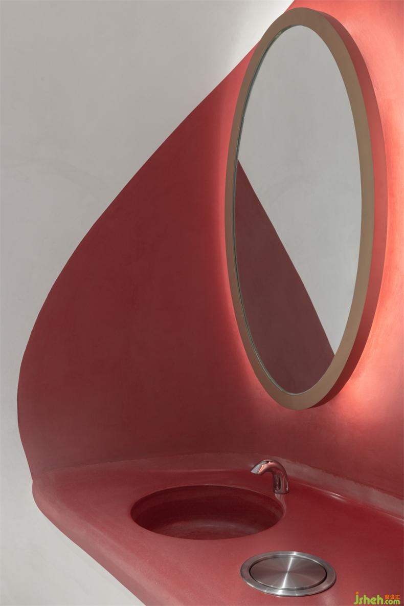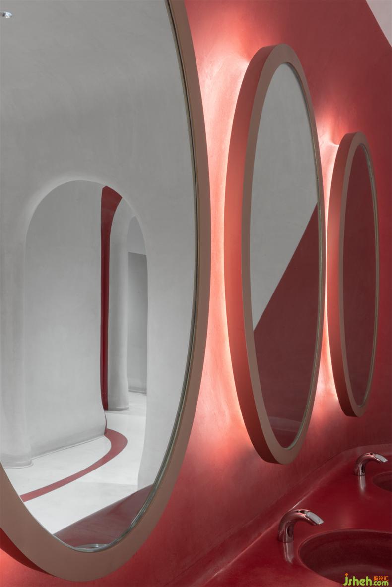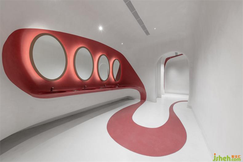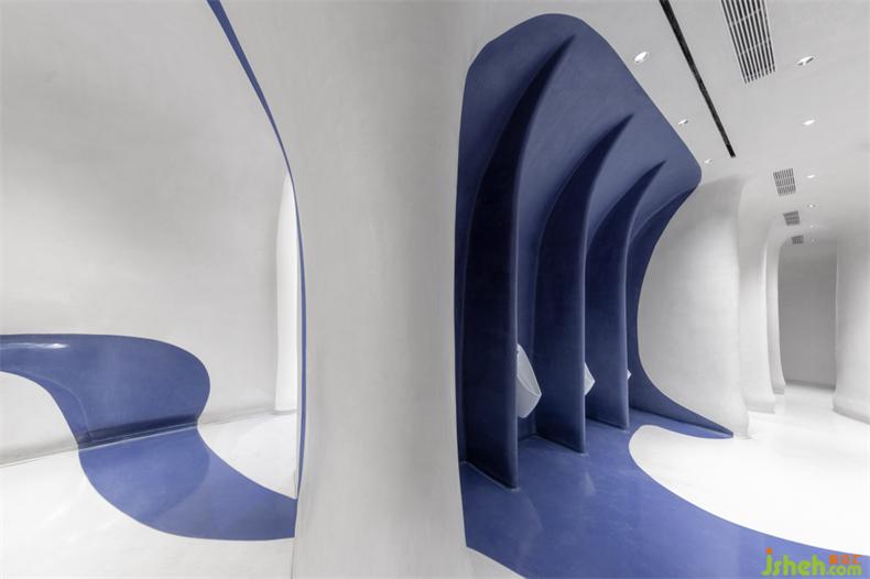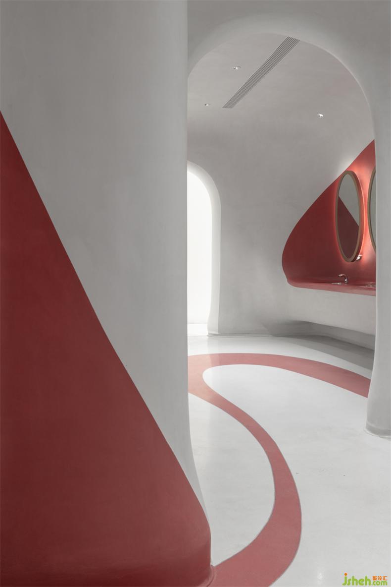 设计师采用步入式格局,室内设计师巧妙利用空间的转折保留住内部优良的私密性。门柱和洗手台皆带有柔质的弧度,与零售区美学系出同源。男女卫生间选用不同的主色调,蜿蜒的红与蓝在白底上绘制出一个抽象画般的舒适领域。
