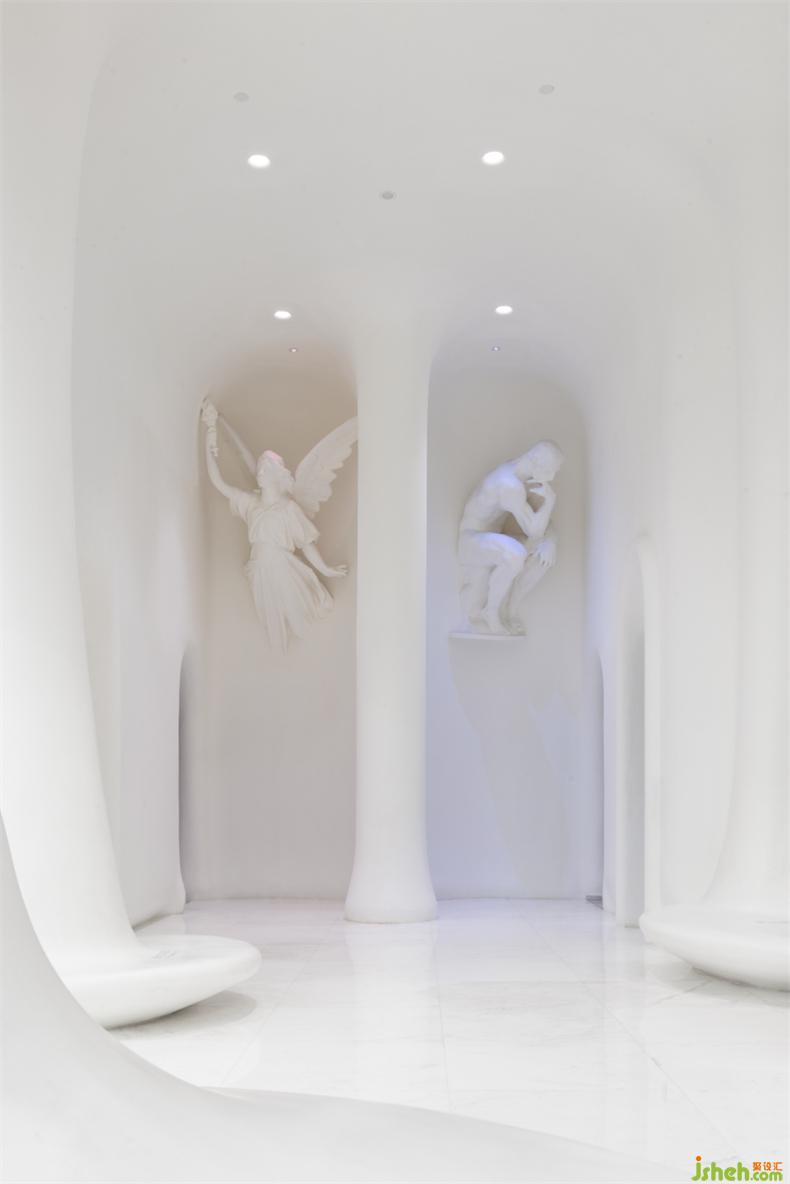 卫生间入口处文化墙上悬立着精致的雅典娜和思考者雕塑门头,灯光攀上其优雅的轮廓,烘托出满满的仪式感。