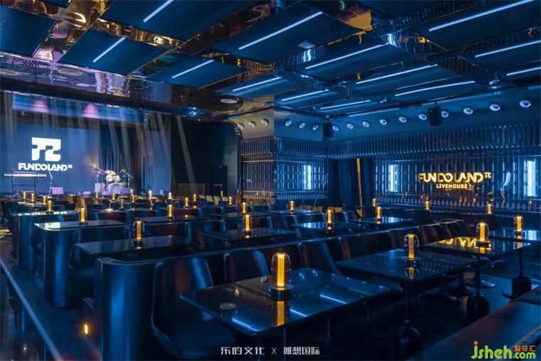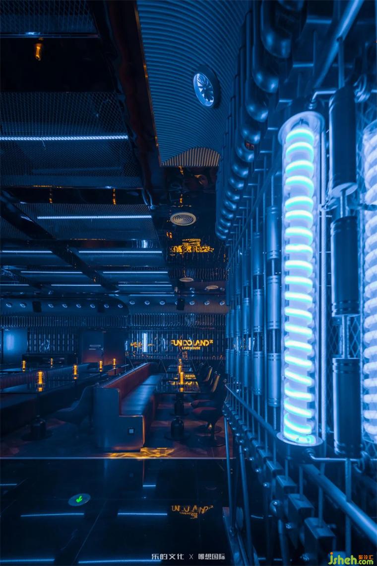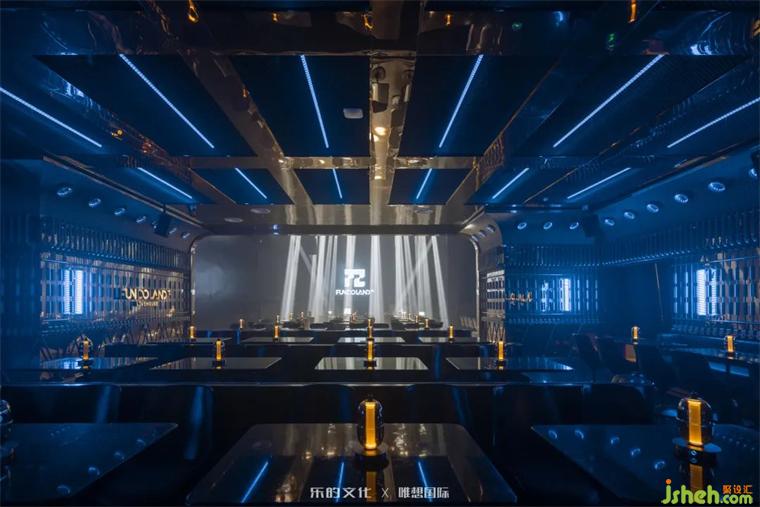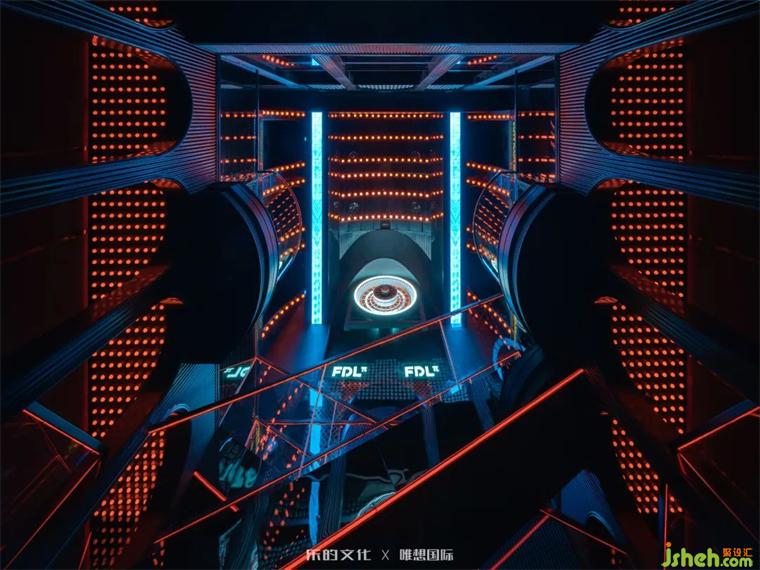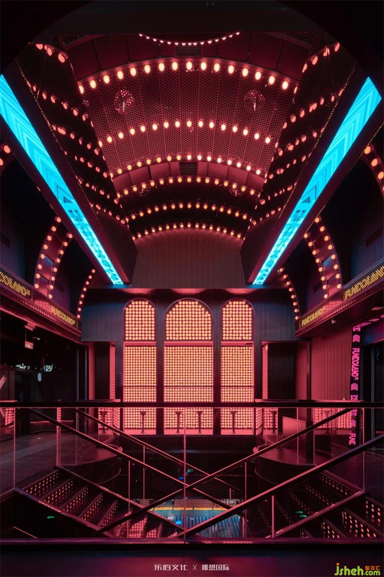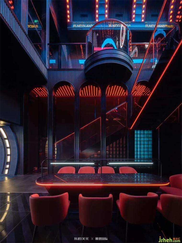 新式KTV入口位于隧道餐酒吧的尽处,装修设计师在平面规划阶段刻意牺牲了二层的部分面积,以打造双层挑高门厅的震撼视觉效果。双座楼梯交错出X字母的造型,设计师运用符号美学将空间的魔幻调性把握得淋漓尽致。装修设计暗黑金属烘托出的神秘氛围,在红色线性灯带和几何光斑的点缀下,呈现出近乎迷幻的未来美学。