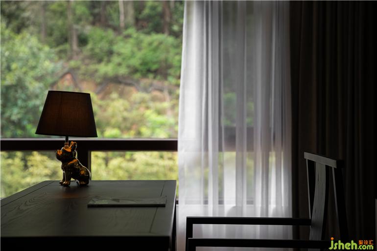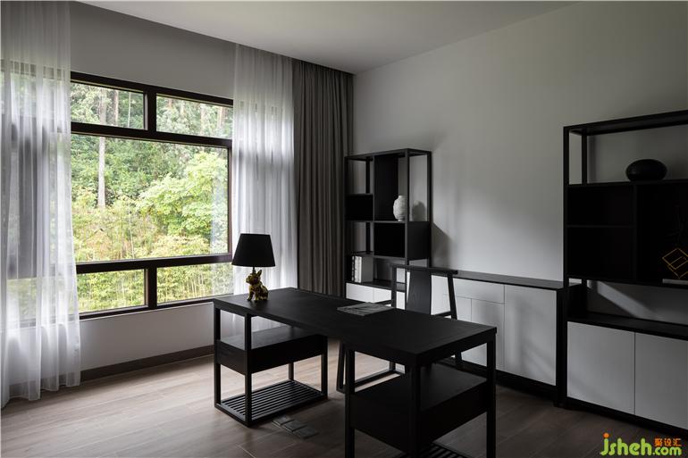 三层的主卧套间舍去厚重的装饰,给人自然平衡的简约感,传达了人居生活的最佳状态。阳光透过落地玻璃窗给沉稳的书房撒上一道美景,每一件单品,每一种材质都在同一空间里呼吸着,互相交织,呈现出极简设计的安静与美好。主卧临山而设,书房飘窗,可欣赏室外山水好景。