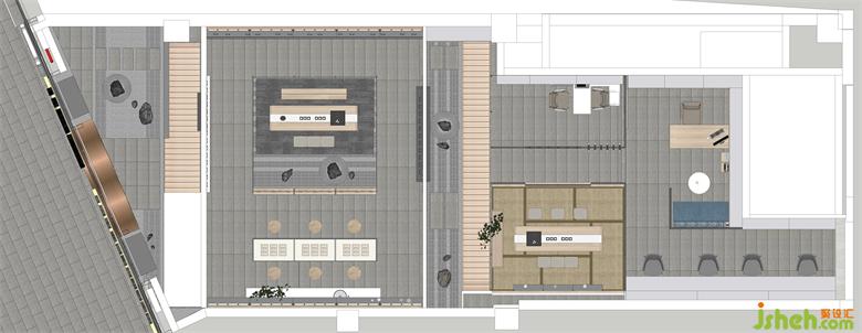 由连廊连接起来的茶室和展示区与入口处的前庭、中庭成为连续的整体,却又各自对应丰富的应用场景,视野一下开阔起来。眼镜店设计空间模糊内与外的界限,内与外是一体的融合的,是都被同等对待的,有一种互动的亲密融合关系,身处其中会有多点连续移动以及视觉层次带来的丰富的质感变化体验。茶室的坡顶、连廊处向外支出的支窗都是内与外的平衡。