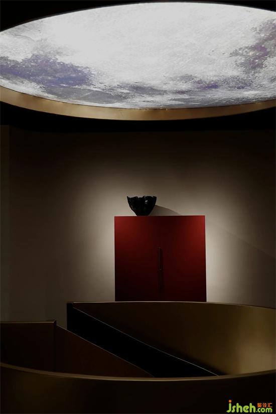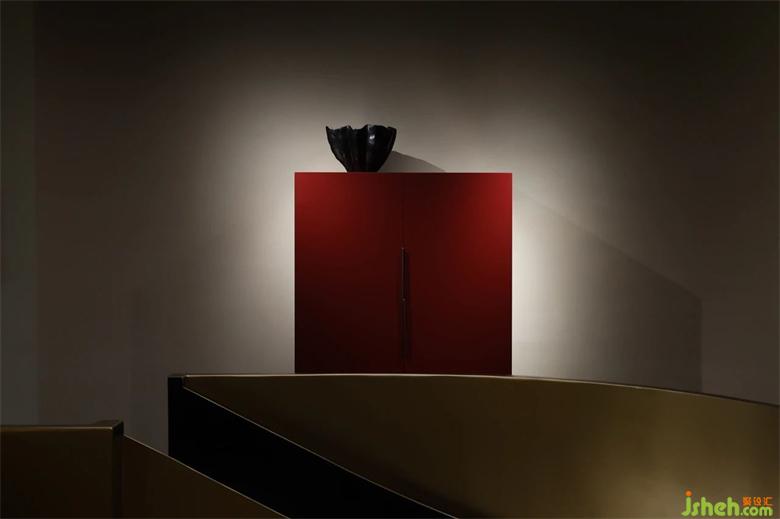 拆除掉局部的楼板过后,在空间置入一个圆形的旋转楼梯在室内连接楼上楼下两个空间。家具展厅设计通过旋转楼梯上到二楼空间,进入到一个充满静谧、神秘的空间。产品凸显了一股神秘的东方气韵,正红色的斗柜为空间增添了一笔浓厚的色彩。产品本身浸透在空间的专属气质,挖掘品牌本身的产品精神,塑造独有的品牌属性。展厅设计