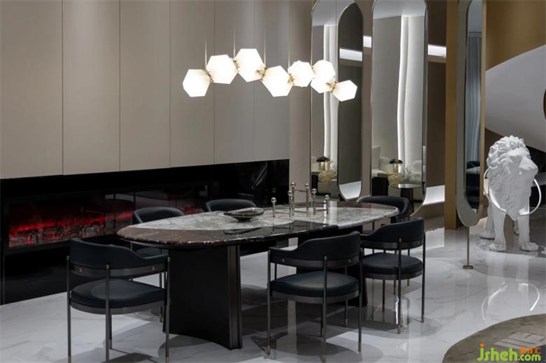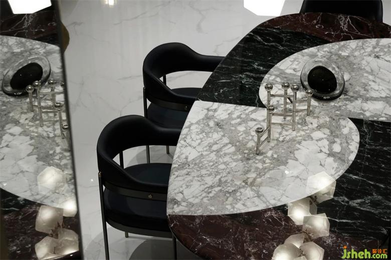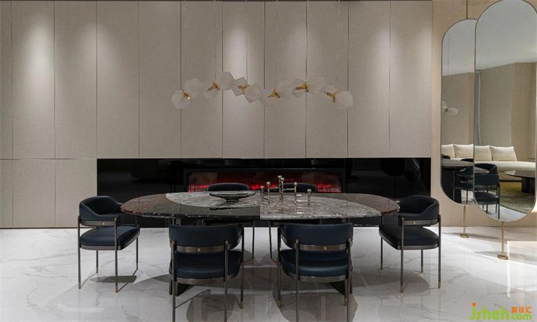餐桌由整个寒江雪石材所打造,保留了其自然温润的质感,