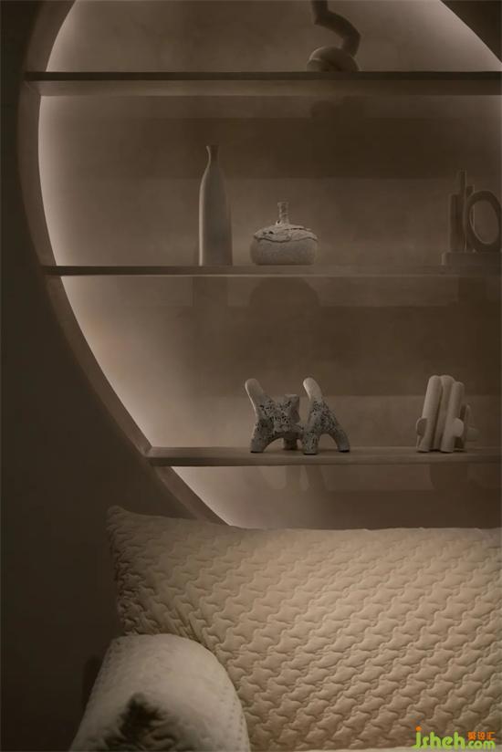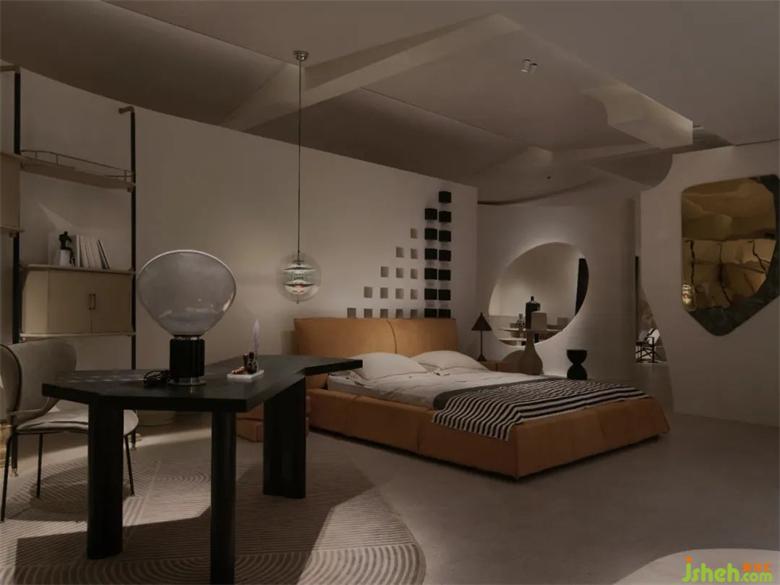 卧室空间静谧而雅奢,磨砂质感的床、黄古铜材质的装置挂镜、家居馆设计以及墙上带有点中古味道的装饰造型,给人的感觉这是一家很有文化素养以及内涵的低调、质朴、一些内敛,圆钝感更有包容性更加温和更容易让人接受。
