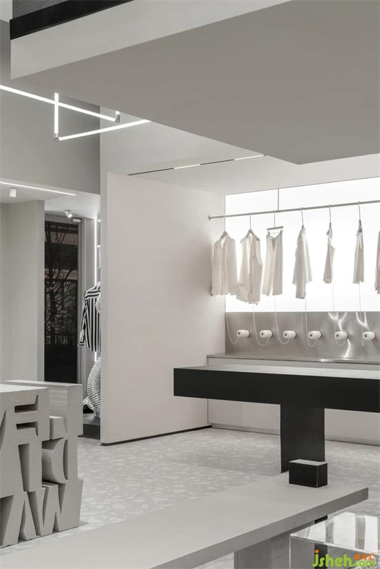 LEDIM WANG除了提供成衣以外,全系列产品也提供尺寸、颜色、面料的个性化定制服务。旗舰店设计因此设计团队将前台接待区与定制服务区,两个功能区整合,用框景的手法,结合背面的定制成衣展示空间,打造出有层次感的复合功能空间。