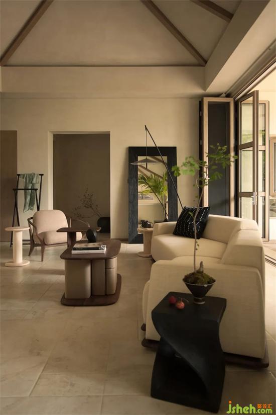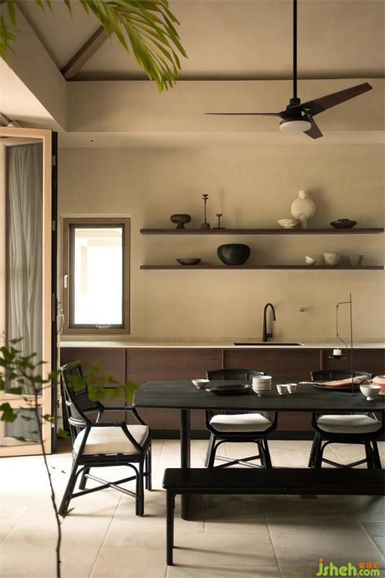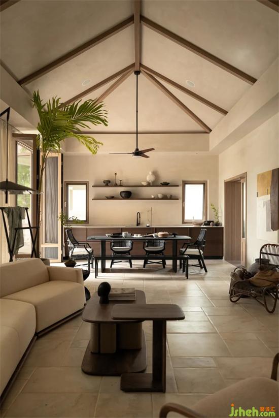 设计团队大刀阔斧,将全家的“动”“乐”两区设置在一层。推掉隔墙,去掉繁复的吊顶,将原本优秀的层高显露,形成通透而宽大的客厅空间,高且敞亮。别墅设计厨房在满足常规居住8人的餐饮需求下一定得足够宽敞且实用。将入户的厨房移动至右侧靠近院落,开窗通风,家人归家路过之时,厨房正热闹,菜香飘至院里,归家之感浓烈。
