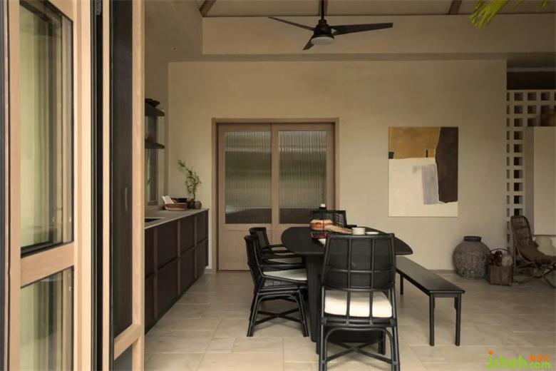 原院落虽说有可看之处,室内却是稍显逊色。下叠海边度假别墅,原本单层建筑面积仅为156平的房屋,被原精装房各种实墙隔断分割成了两层,动线及通风极差,一层除了一个超大的卧室占据了一层大部分的空间,仅剩的空间还将厨房设置在了正大门的左侧,入门后若未开启室内空调,便进入了一个完全被阻隔的闷热客厅,后院风景再美也无视角欣赏。偌大卧室,被繁复的木作及上墙的木雕堵得喘不过气。