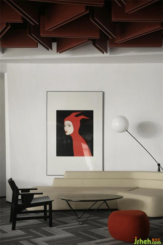 张占占的作品大都以孤独作为主题,办公设计以简练柔和的线条、简洁而标志性的红黑配色、可爱而沉默的动物形象进行传达。