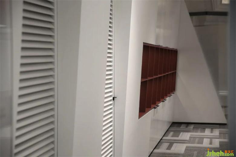 进入内部,接待区保持同外部立面的视觉延续性,办公设计连续切面在空间中以几何形态自由穿插,组成空间中三个重要的功能区域(接待前厅/会议办公/开放办公)。
