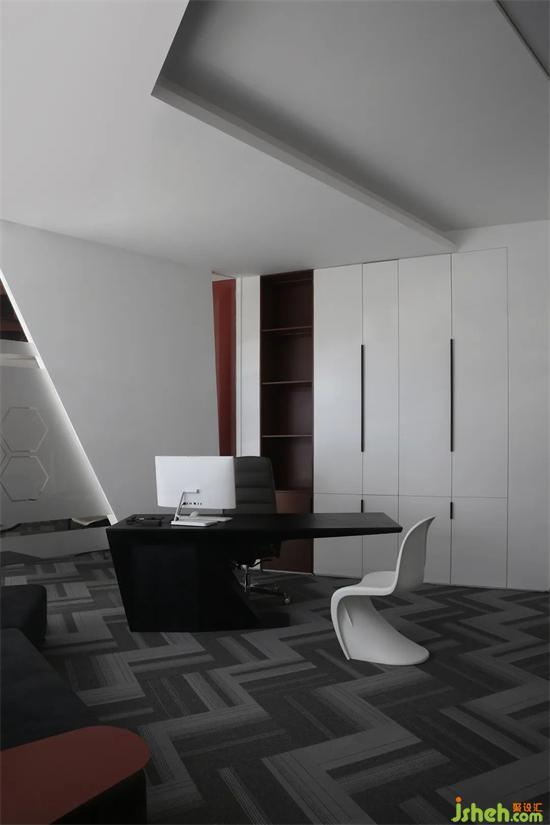 探索事物于不同角度的发散认知,让动线更倾向于自由迂回的环绕,办公设计简洁的红与白柜体尽可能的少而简的空间陈列,通过色彩与材质的呼应,传达由近到远的视觉延伸。