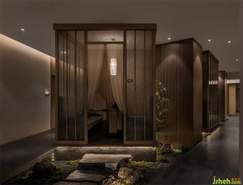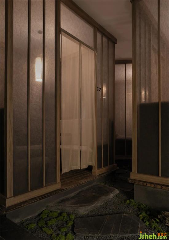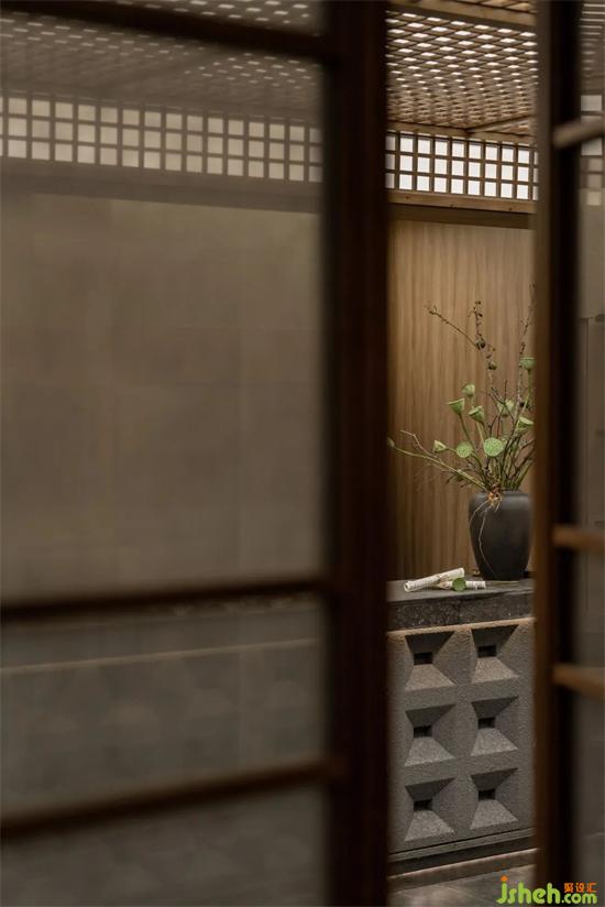 在遵循茶空间需要静谧的氛围,每个茶室盒子用夹丝玻璃作隔断,遵循自然采光的柔和,茶楼设计观感上抽离了世俗五感色彩的行进空间,也是一个暗示进入非常态潜意识状态的空间。它是进入一个内有洞天的桃花源幻境的前序,亦是一种开始进入梦境的体验。