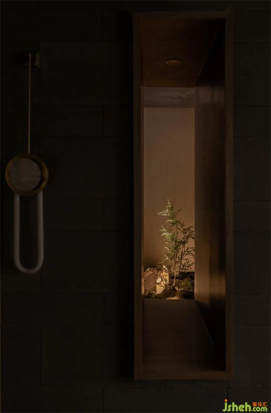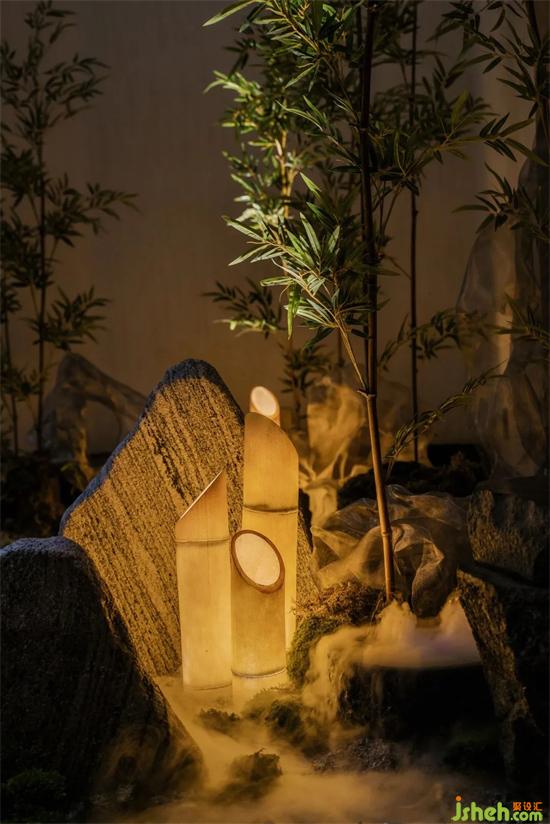 茶道卡座底下怪石嶙峋,竹叶茂密,共同组合成了周边的山林景观。茶楼设计浅薄真实山石拟山之高低起伏,山形各异的姿态,从侧边进入到其中,近可观其中的奥秘,远可看世间灯火阑珊。