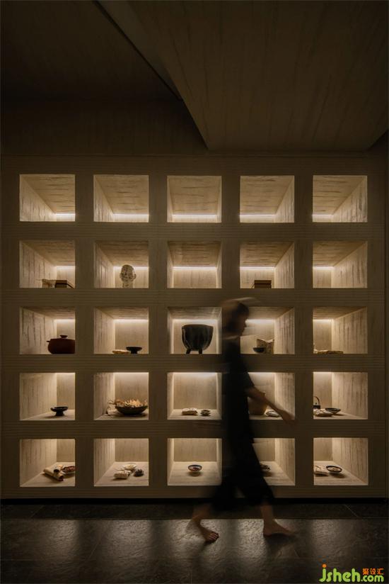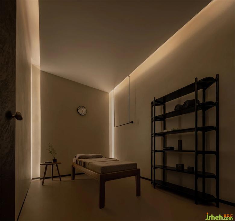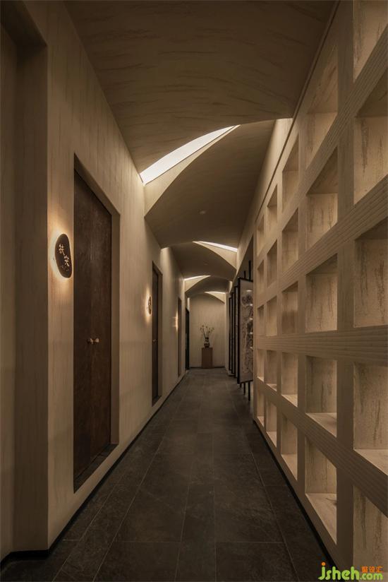 根据整体空间的⻣骼经络所造之形,将相⽣之道体现得淋漓尽致。通道上⽅顶上错落有致的造型及侧边规整排列的柜格不光提供了整体通道的照明,也将整体⽆聊平叙的空间增加了层次。会所设计通过通道,⾛道两侧的理疗室透过光的指引分布在合适区域,每个区域都能近距离的联通公共盥洗室,将动线简化更加⽅便。