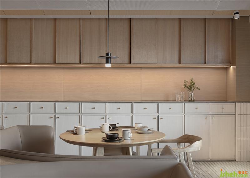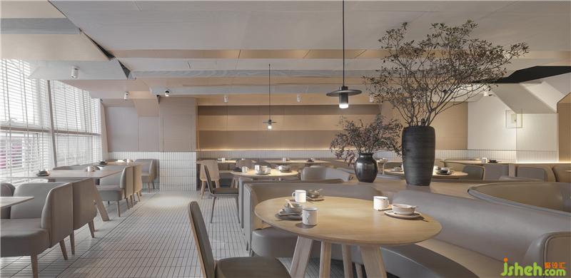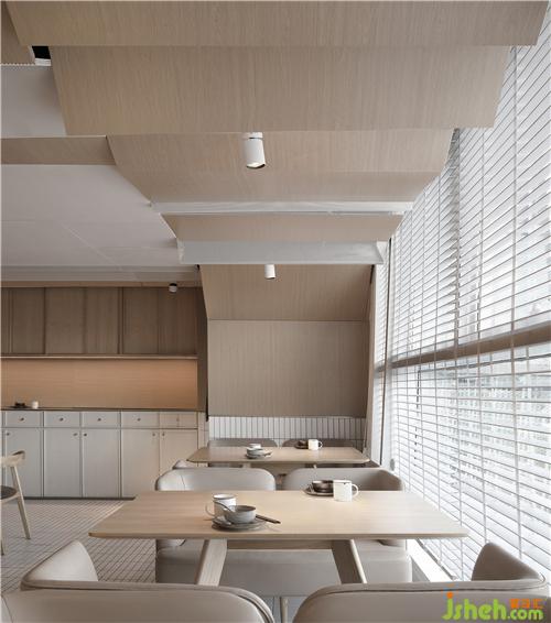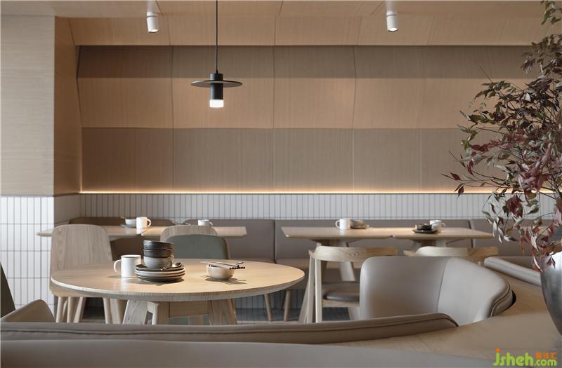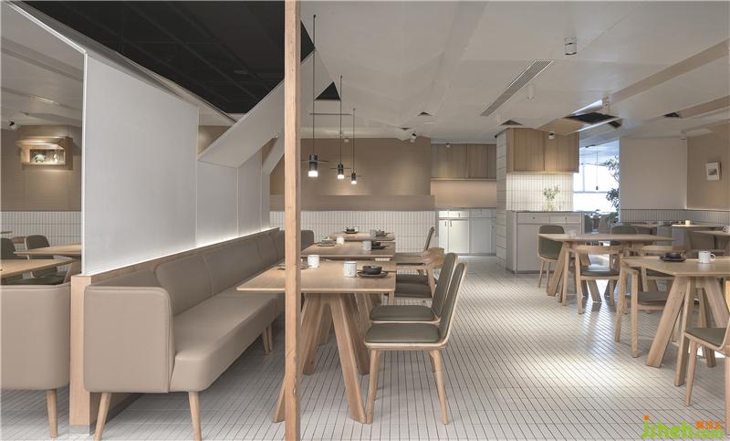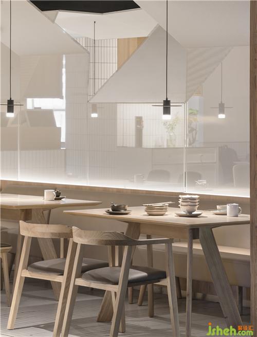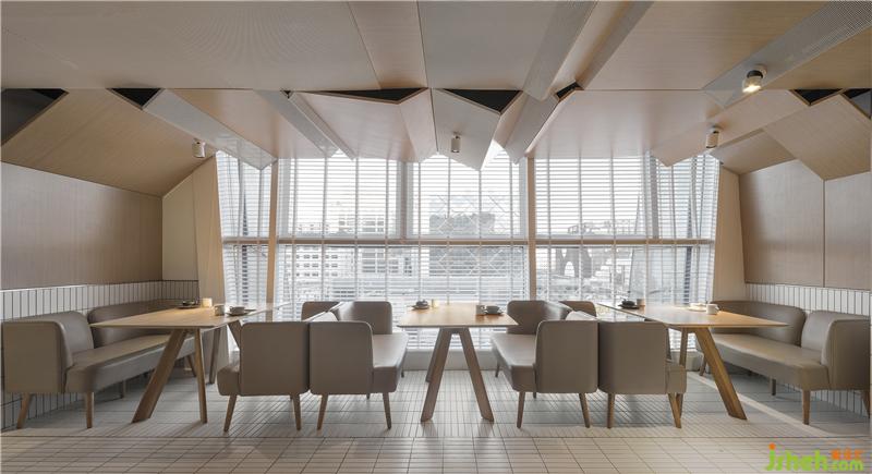 整场空间布局是矩形交错的场地,层高只有2500mm。如何让低矮的空间不具压迫感是我们这次设计的切入点。屋和树是雁舍品牌设计视觉的延续,是以家为核心对爱的传达。空间中延续的屋脊是设计师对雁舍“爱”的诠释,也是为这次设计中赋予的新的独特观感。高低起伏,错落层叠,以空间自由舒展 ,韵律的屋脊褶皱与静谧的空间完美交融,没有高调的设计,我们想用现代的材料营造出"侘寂"那种简单而返璞归真的氛围。餐厅设计