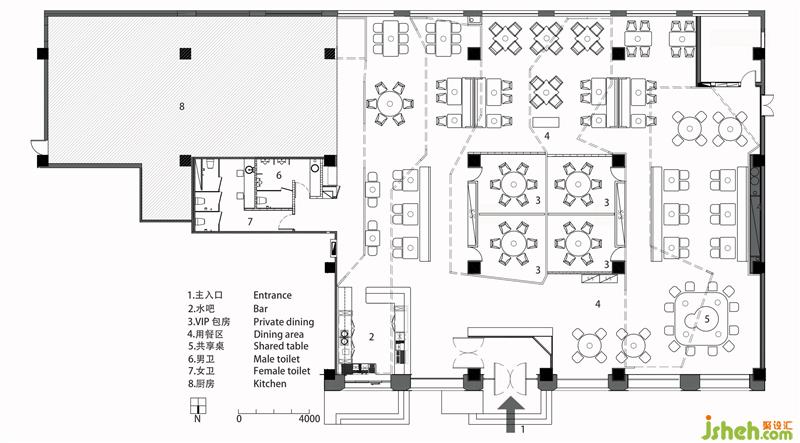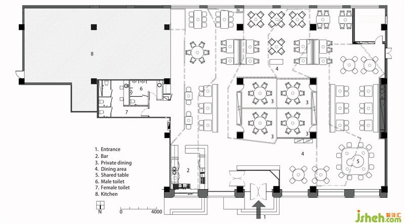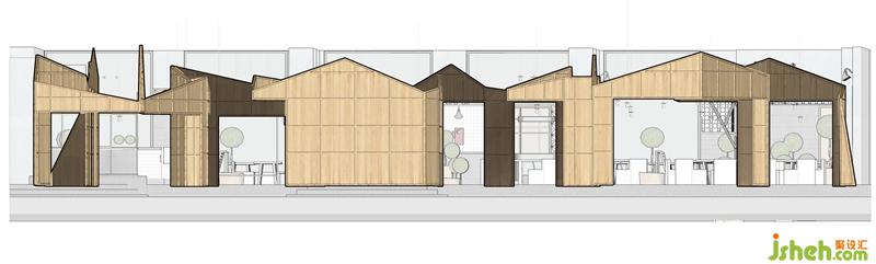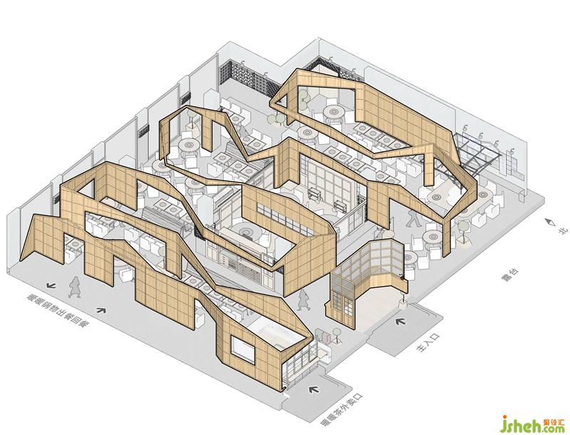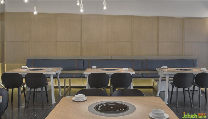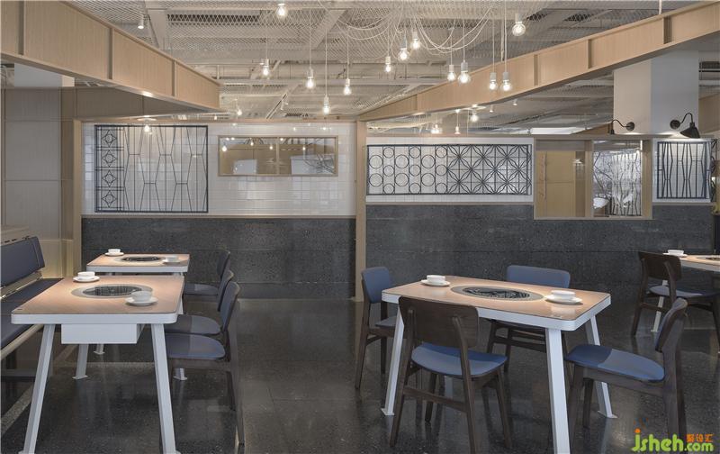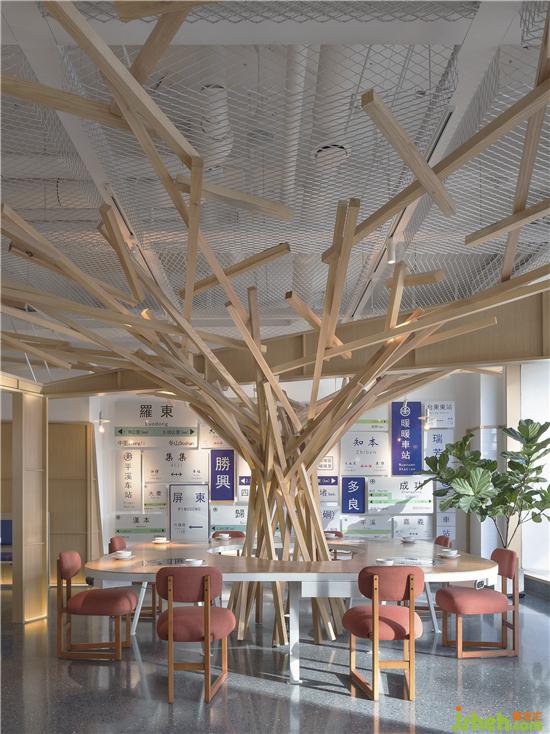 Looking up, the shapes of the gables from the Taiwan Railway Station in the space rise and fall. It is sometimes parallel and sometimes curved, and the cascading gables are like jumping notes. When it lights up, it is a warm song. It strings up the warm sky, sheltering guests from the wind and rain, bringing warmth. The designer wanted to use the language of the gable to bring guests back to the ancient flavor of the old times and feel the customs of Taiwan during that time. Functionally, it also stabilizes the overall space vision and distinguish between spaces. The gable in the central area functions as a partition.餐厅设计