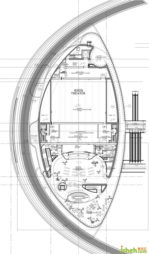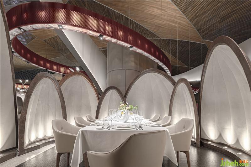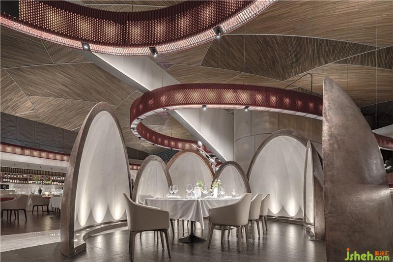 国家大剧院东西横跨212.2米,拥有世界上最大的穹顶,其包含的建筑空间多样,分别承担了演出、展示、陈列等各种功能,而餐厅部分的功能相对于其他北京餐厅设计空间来说功能更加复杂。餐厅以中部旋转楼梯为界分为南北两区:南区满足观演大众需求,有着休闲咖啡与正餐的功能,能够小范围地欣赏钢琴演奏;北区为多功能区,其功能更为正式,可供三十至六十人的宴会、发布会或是庆功酒会。