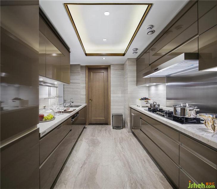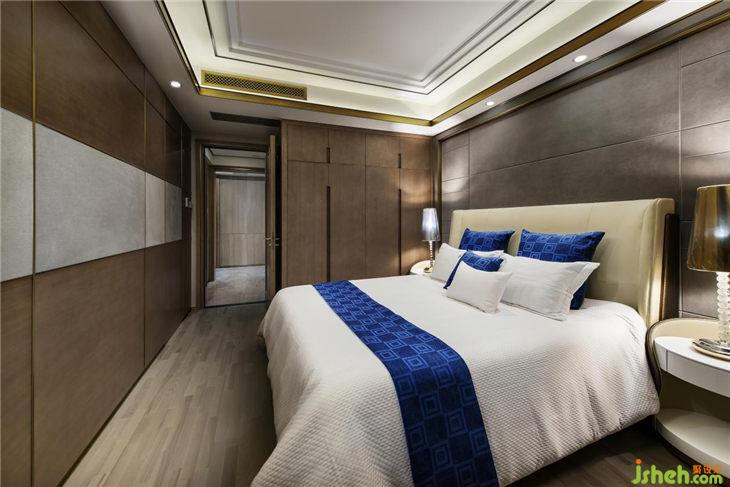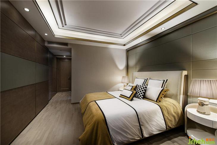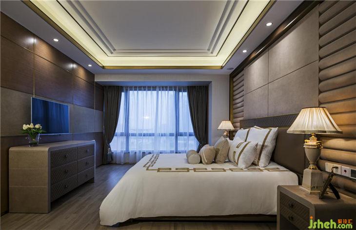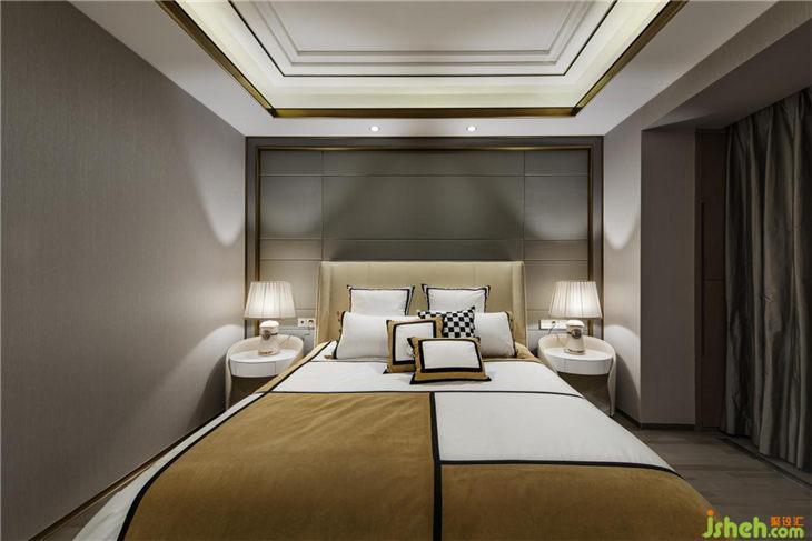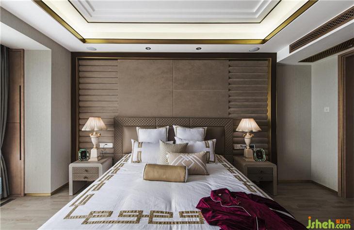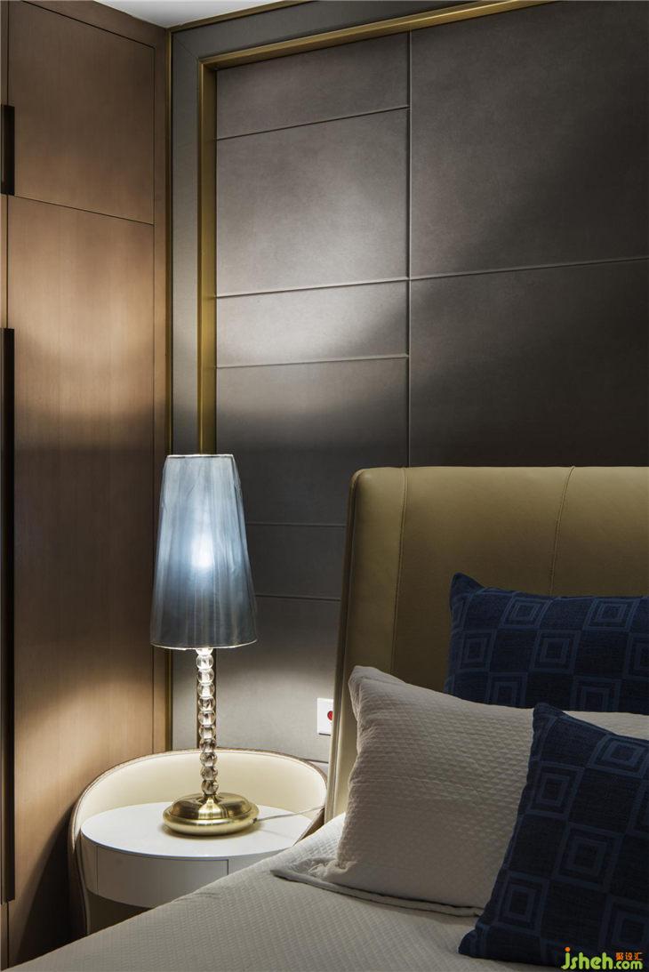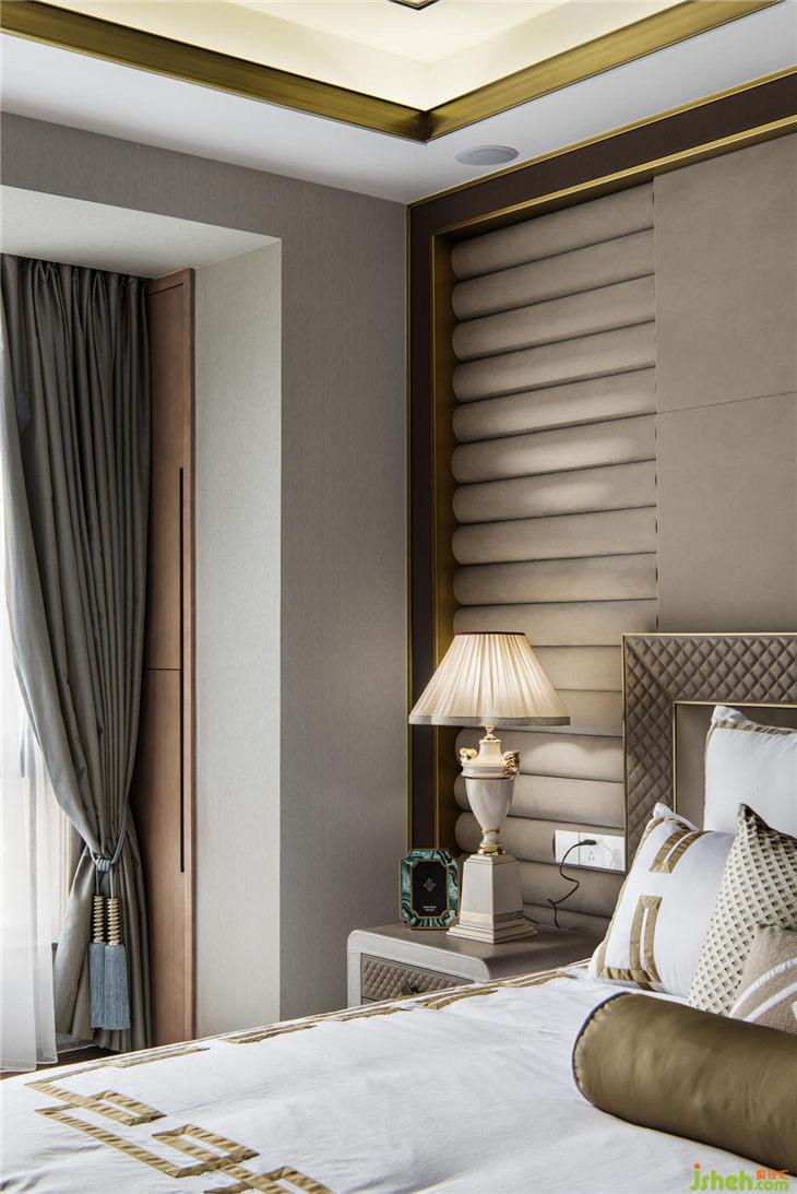 别具现代奢华感的主卧,设计师在这里采用了金色线条勾勒出现代奢华酒店式的卧塌空间,富丽堂皇而又别致精巧。设计风格延续了“港式格调”的线条感,只是床头背景墙增加了曲线波纹等进口毛皮硬包,令整体视觉更为陈炼柔和。