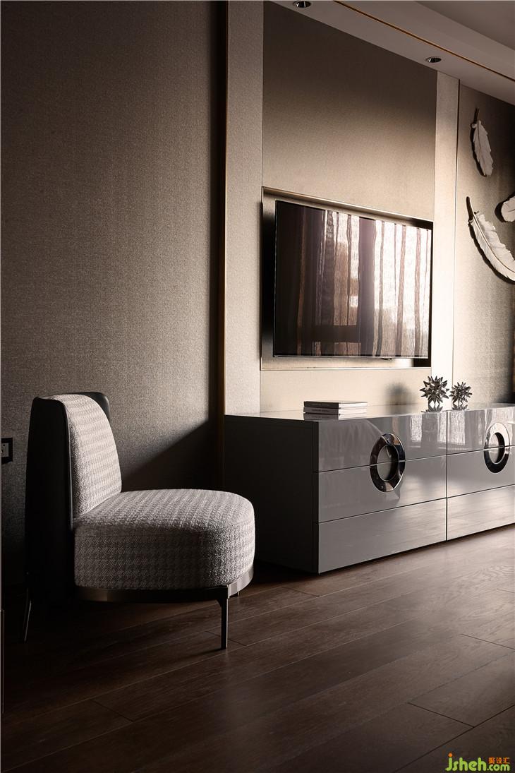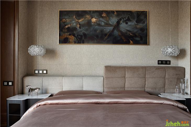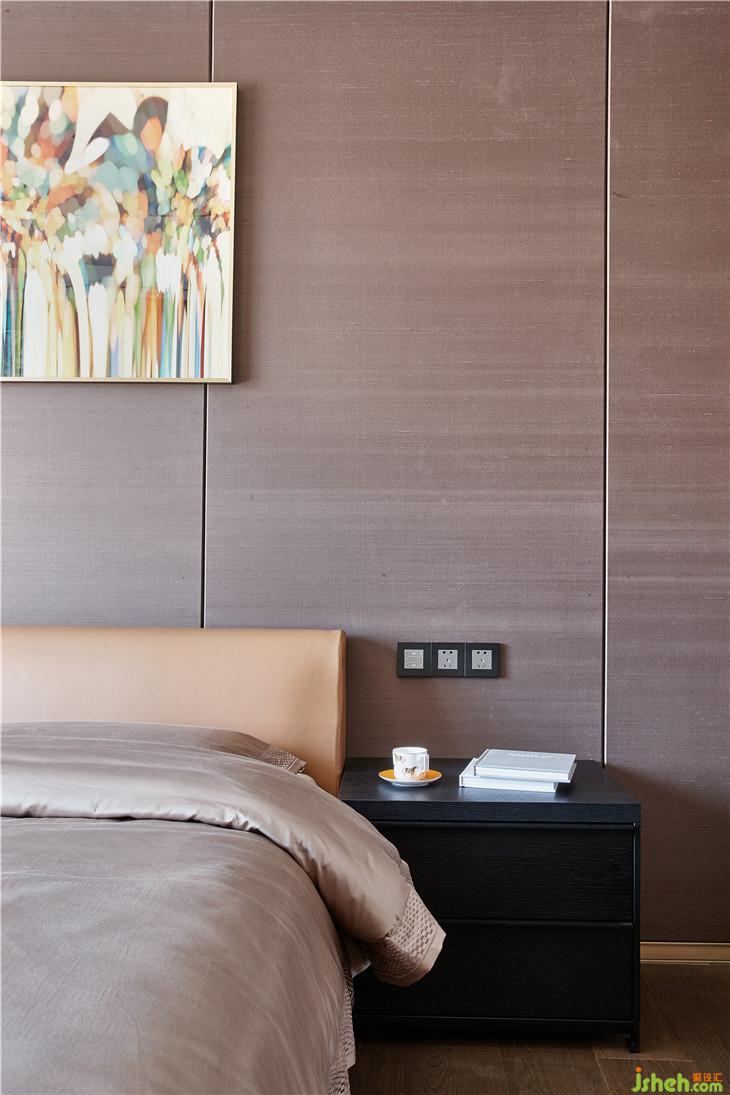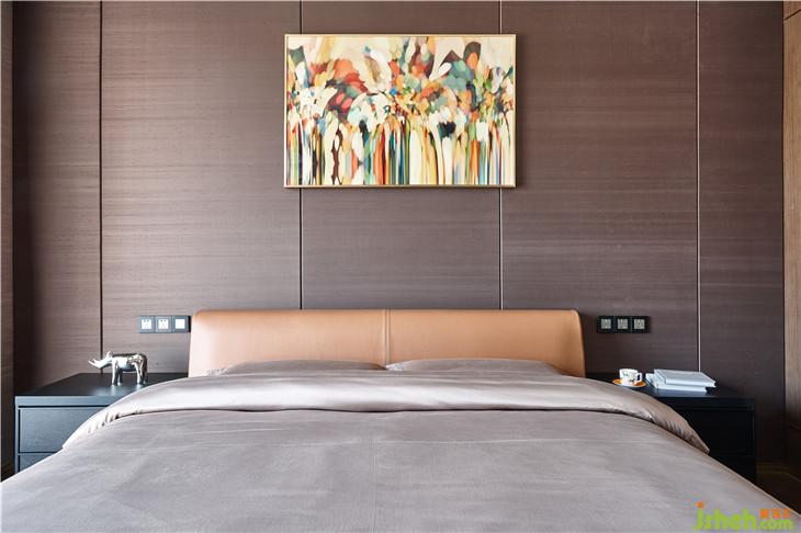 一层的客卧套间,设计师利用大面积的浅咖色硬包背景墙,与橙色的床背景做配搭,营造出一种典雅而不失时尚的空间氛围,整个卧室氛围便于安稳睡眠。背景墙正中间,装饰画点缀其中,色彩绚烂、热烈奔放,使得空间视觉效果更为丰富。