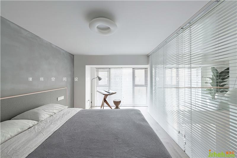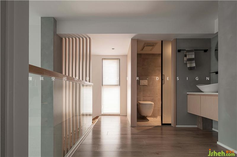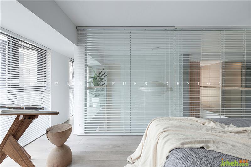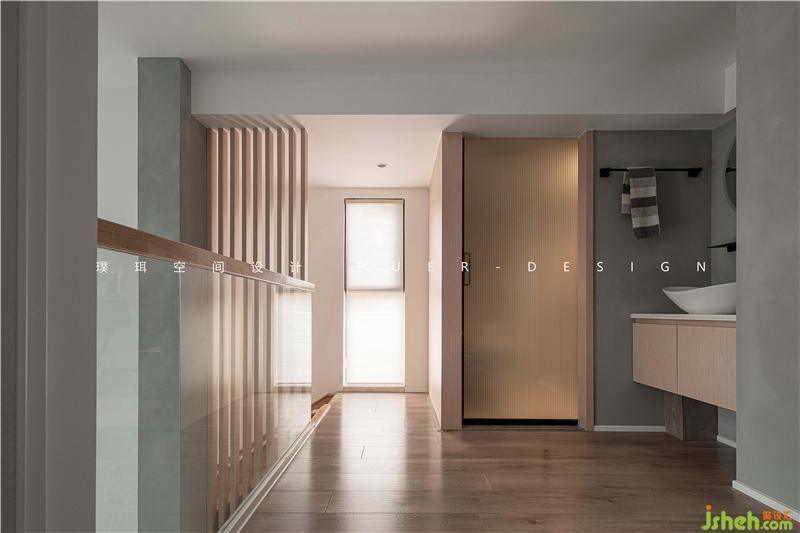 主卧与挑高区以玻璃为隔墙,延伸出空间通透的视觉感。
