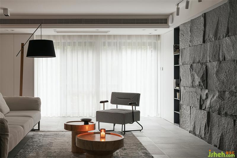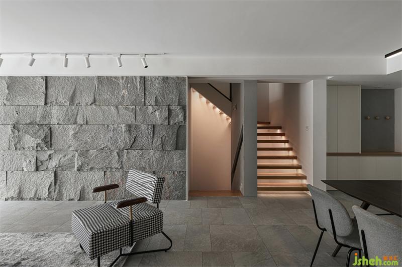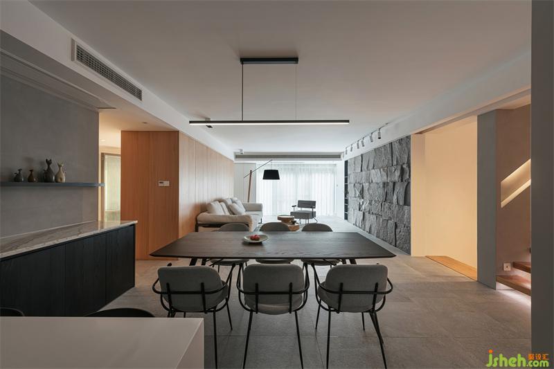 天然的材质总是充满了温度,如木质般温润,如磐石般可靠,依靠独特的纹理和质感,让空间与自然升温发酵,充满原始质朴的能量。不规则原石墙面,铺展开亲近自然的真实感官,给予空间张力与生命力,于空间增添投石问水般的律动;配合大面积落地窗引入的自然光,糅合交织出空间光影的韵律。