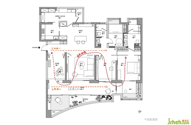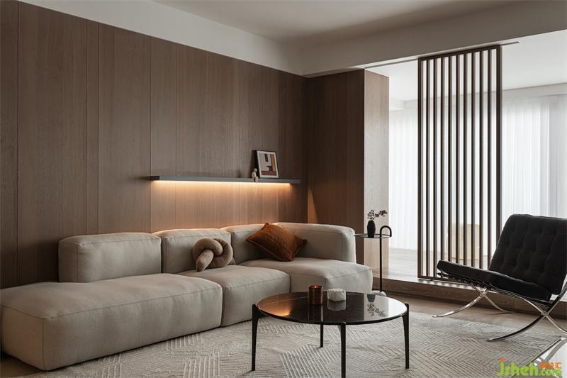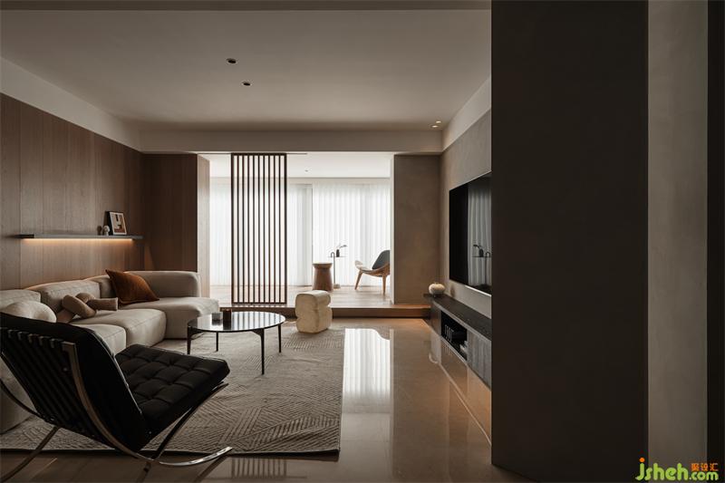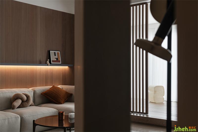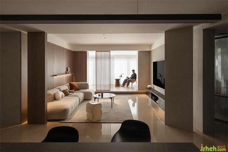 跳脱传统布局,打破空间隔阂,将乐器室→客厅→书房→主卧划分为每个相对独立的半包裹空间,璞珥空间设计通过两条过道串联不同区域,一条是从玄关到主卧的室内主动线,另一条则是休闲区的主动线,形成灵活多变的“回”形动线。