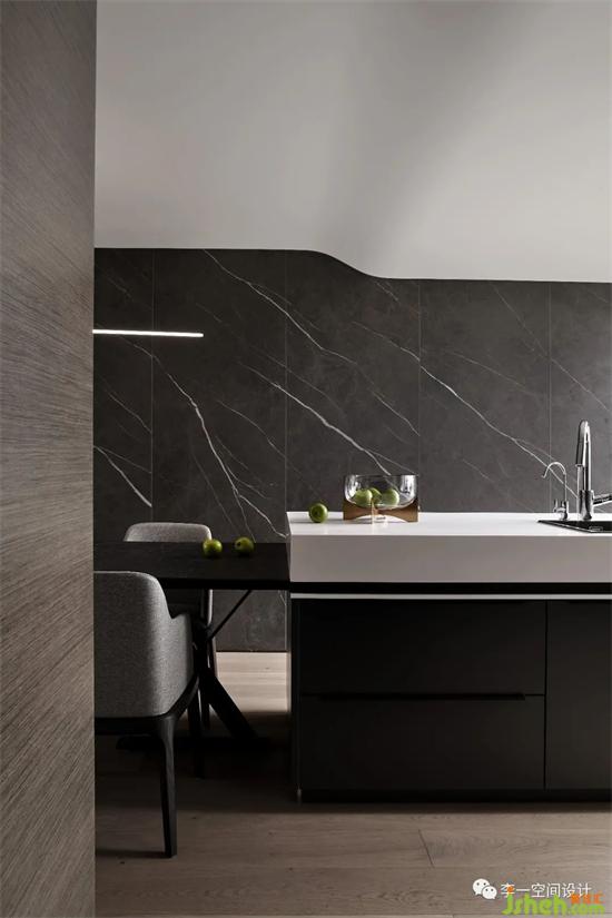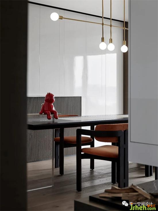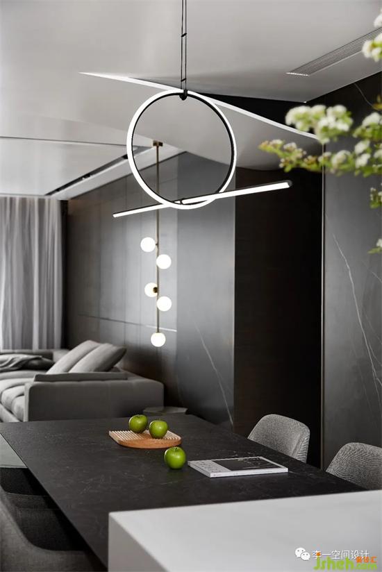 客餐厅空间受建筑原始条件的限制,梁柱结构的特性为原本就条件苛刻的层高可装修设计谓雪上加霜,我们利用梁底与楼板的高差,通过曲线化解了过梁与铺梁的受限,也改变了传统二级吊顶的陈旧视觉。