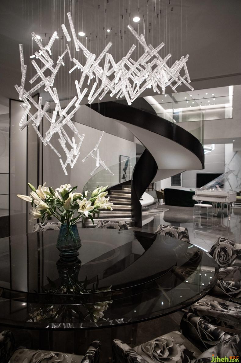 客厅里的圆形楼梯犹如雕塑般的存在,是设计中的神来之笔。这个楼梯与其说是功能需要,倒不如说是精神需要。因为从功能上来说,从三层至二层可以有一个楼梯和电梯来通达,实际上,这个圆形楼梯是专门为女主人设置的,它够大够气派形态优雅,成为客厅空间的核心,统领空间结构,有了它,客厅空间就有了一种力量与气场,有了灵魂。它,是对主人生命的赞美。我们希望,每一天早晨,女主人从这个圆形楼梯缓缓拾级而下,环顾高敞的客厅,有一种“女王”般的骄傲、优雅、豪迈,胸怀壮阔,大爱无疆。