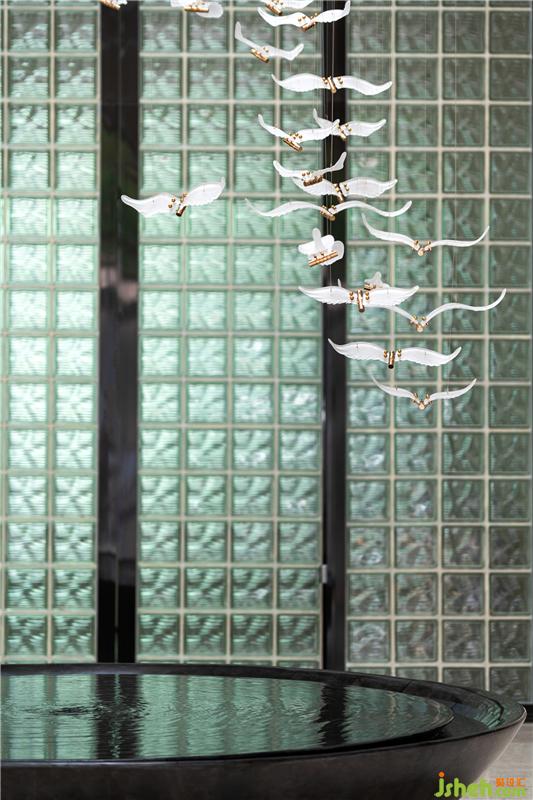 采光天窗的介入是神来之笔,阳光从建筑顶面的天窗倾泻而下,为大堂空间的演绎拉开帷幕,天窗上的灯光艺术装置垂坠而下,光影变幻熠熠生辉,形成步入各个空间的纽带和亮点。室内设计师